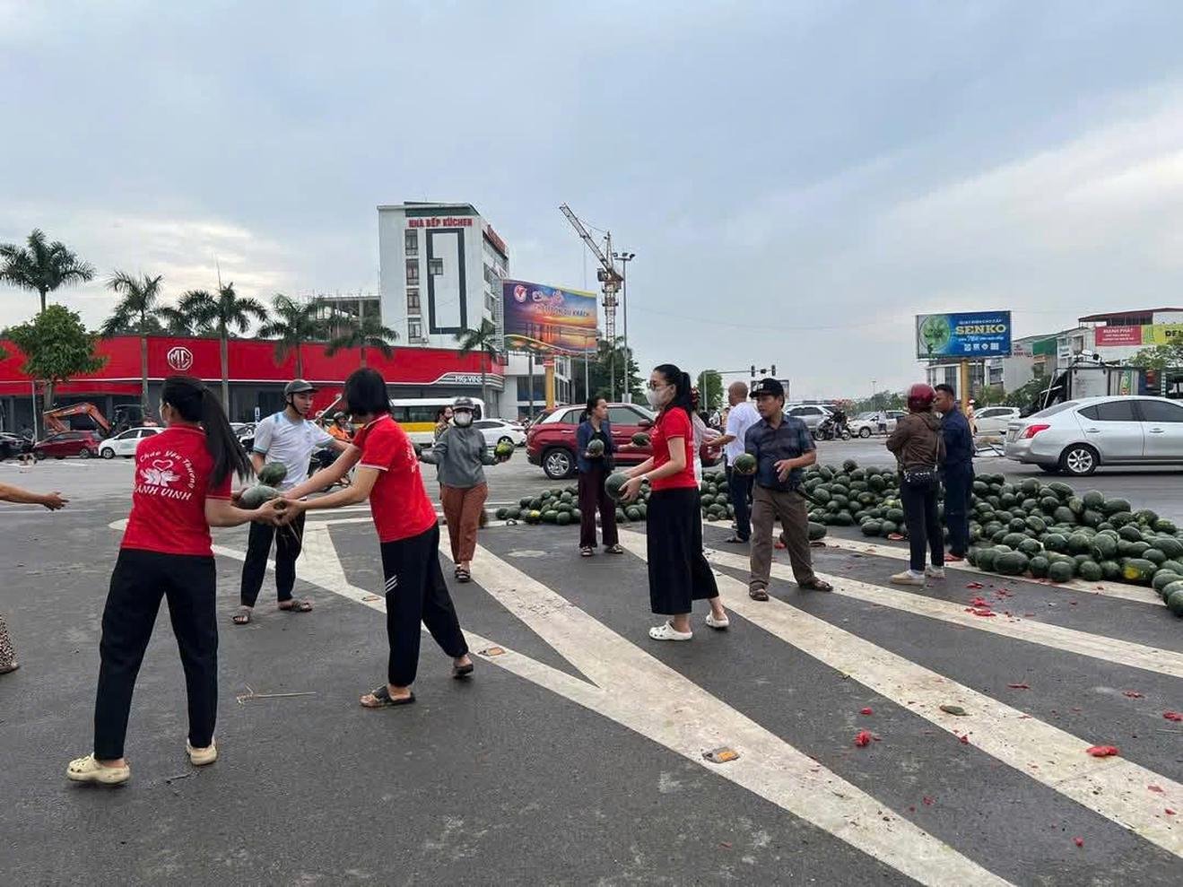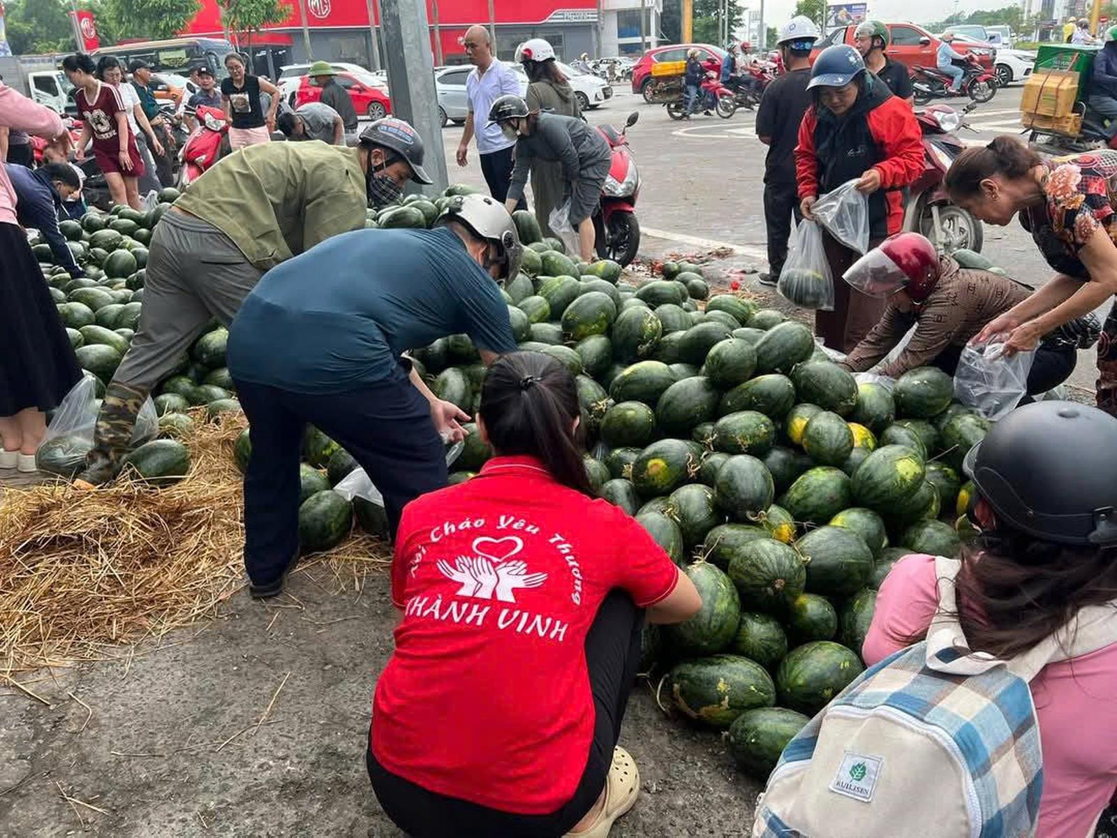 Người dân xếp hàng dài thu gom dưa hấu hỗ trợ tài xế gặp nạn. Ảnh: P.V