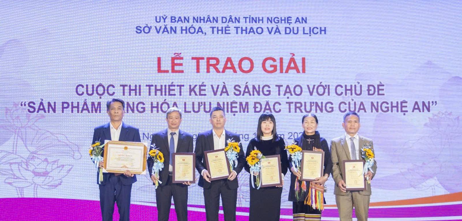 Trao giải cho các đơn vị tham gia cuộc thi Thiết kế và sáng tạo với chủ đề "Sản phẩm hàng hóa lưu niệm đặc trưng của Nghệ An". Ảnh: Diệp Thanh