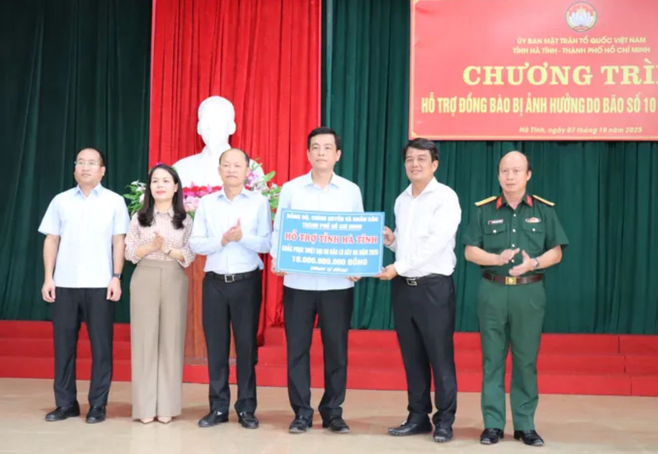 Tại tỉnh Hà Tĩnh, thay mặt Đảng bộ, chính quyền và Nhân dân TP Hồ Chí Minh, ông Bùi Thanh Nhân trao 10 tỷ đồng hỗ trợ người dân khắc phục hậu quả bão số 10. Dịp này, Sở Y tế TP Hồ Chí Minh cũng trao tặng túi thuốc hỗ trợ y tế cho Sở Y tế tỉnh Hà Tĩnh.