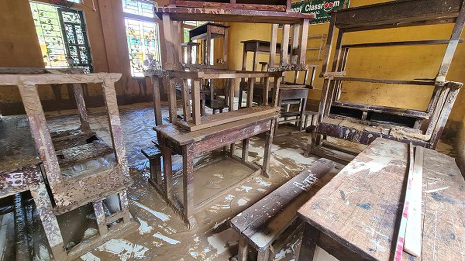 Bàn ghế lấm lem bùn đất, nhiều đồ dùng học tập hư hỏng. Ảnh: Bùi Bình