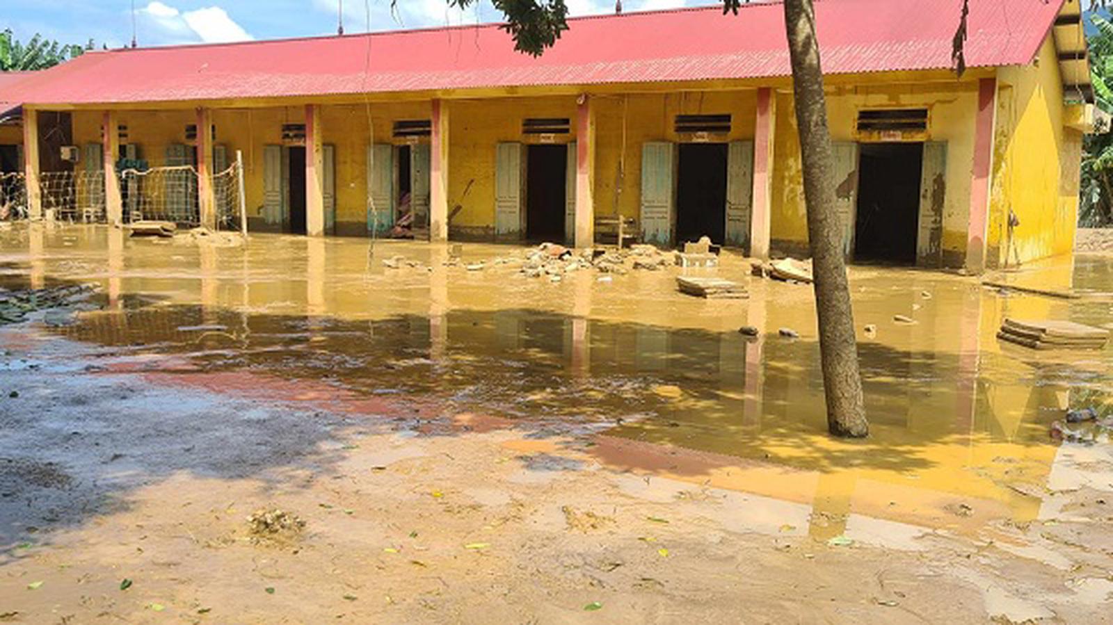 Bà Nguyễn Thu Hương, Hiệu trưởng Trường Tiểu học và Trung học cơ sở xã Minh Chuẩn cho biết, nước ngập qua tầng 1 của dãy nhà hai tầng, khi nước rút để lại lớp bùn có chỗ cao gần nửa mét. Ảnh: Bùi Bình