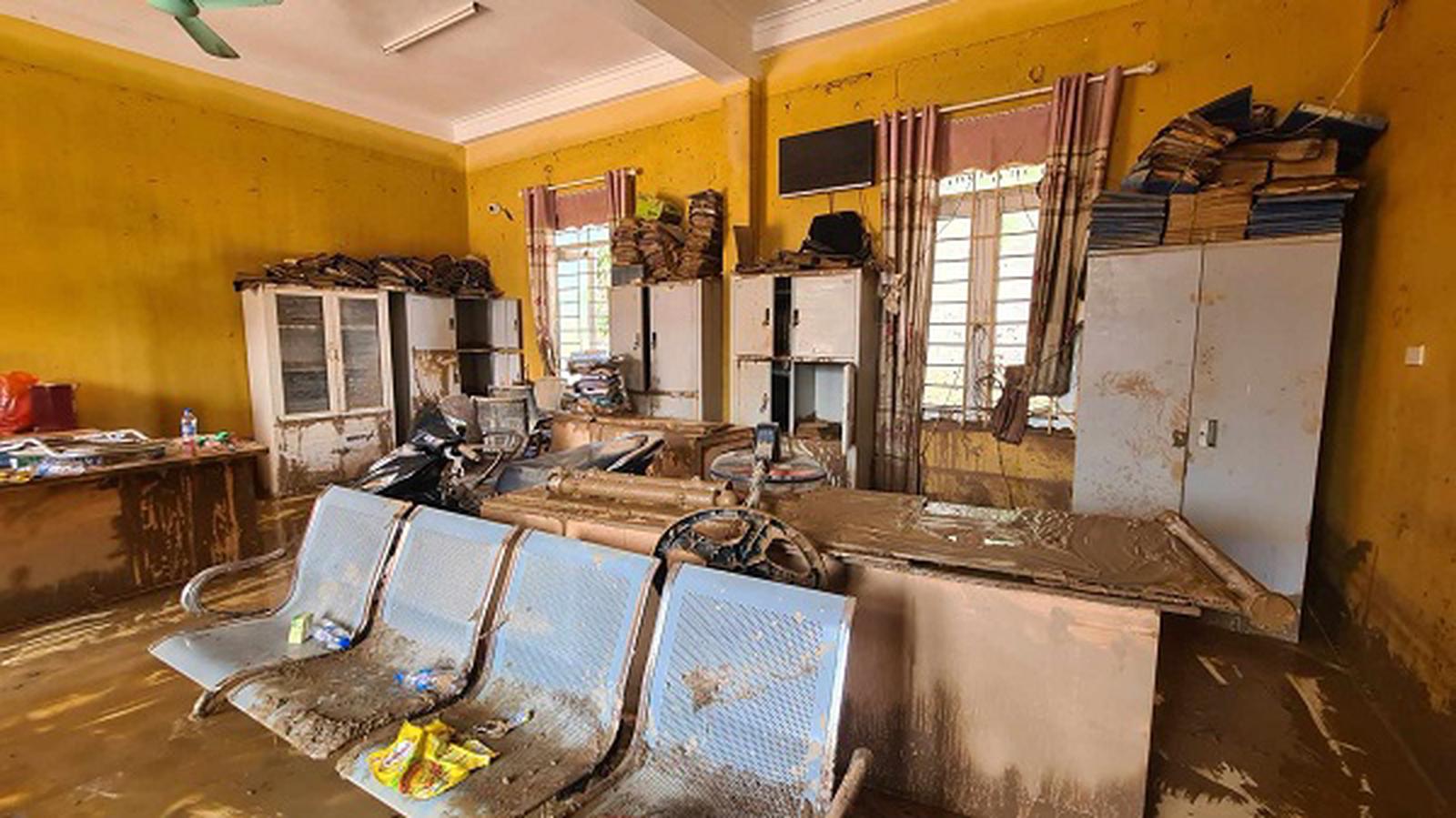 Bùn đất bám lên tường, thiết bị, bàn ghế tại Bộ phận Một cửa xã Minh Chuẩn. Ảnh: Bùi Bình
