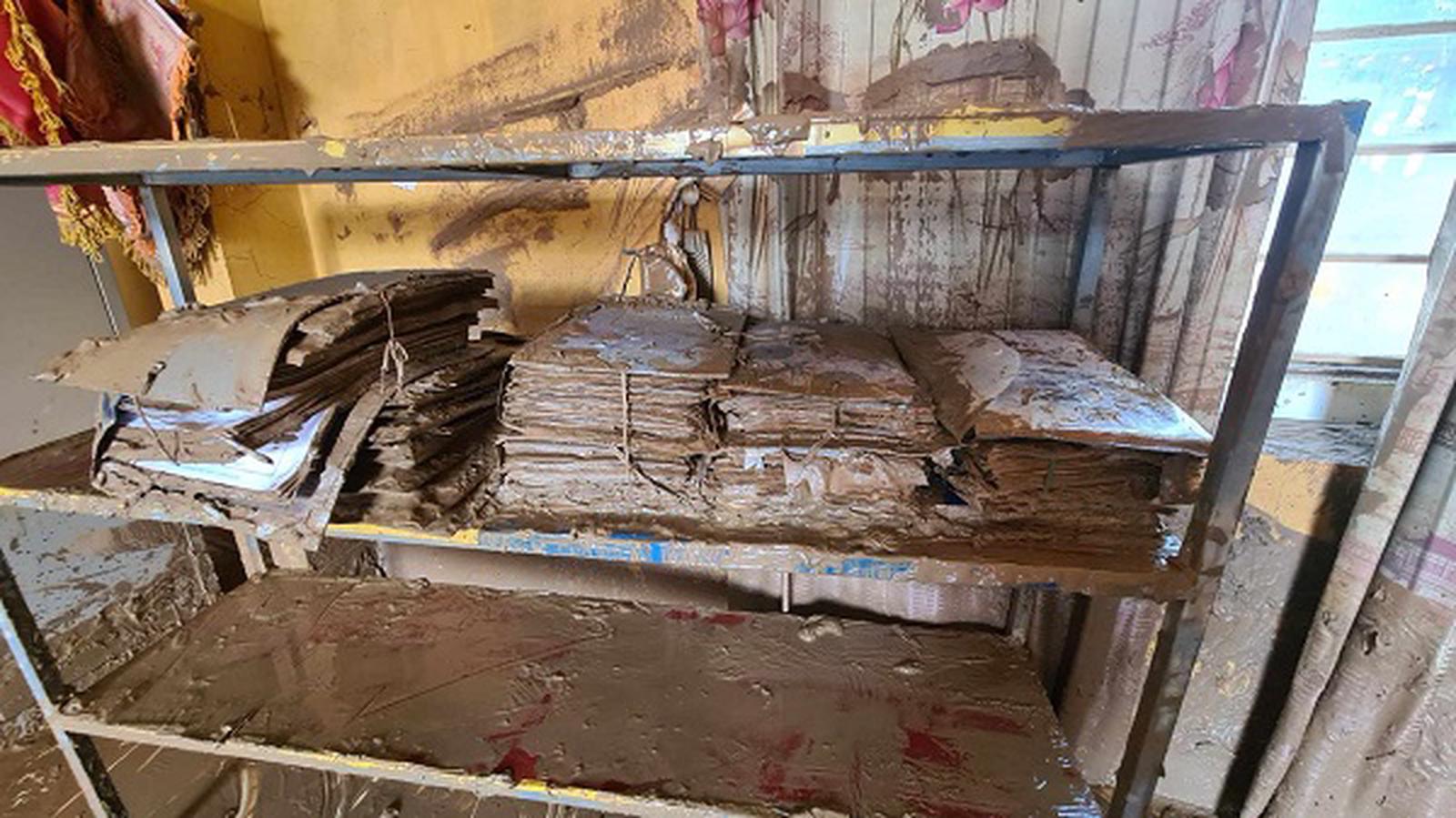 Chồng hồ sơ, tài liệu của xã nhuộm màu nâu của bùn đất. Ảnh: Bùi Bình