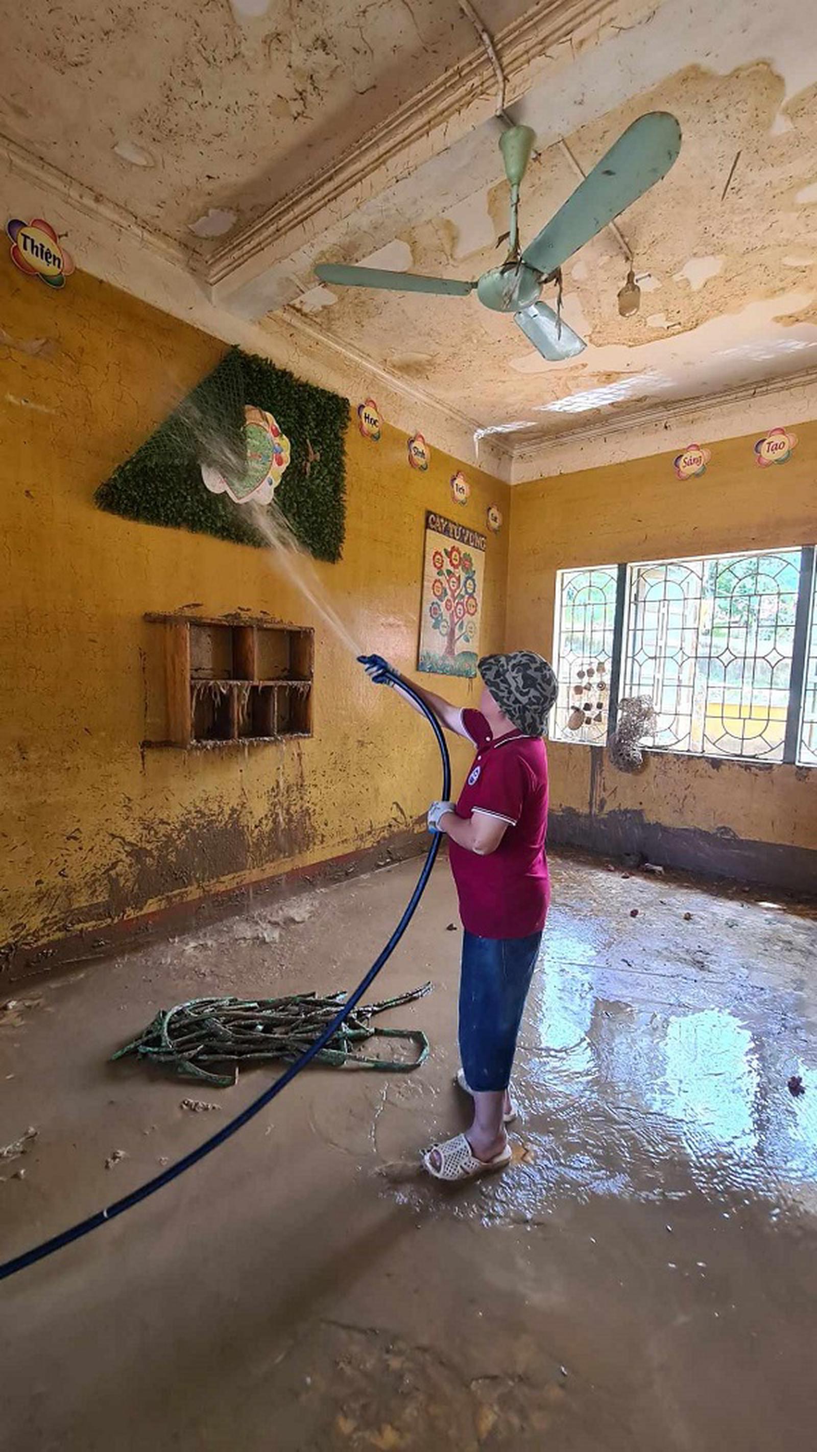 Hiệu trưởng cũng cho biết, khó khăn lớn nhất lúc này là phải khắc phục hệ thống điện, nước bị hỏng. Nhanh nhất cũng phải đến ngày 23/9 mới đón học sinh vào học. Ảnh: Bùi Bình