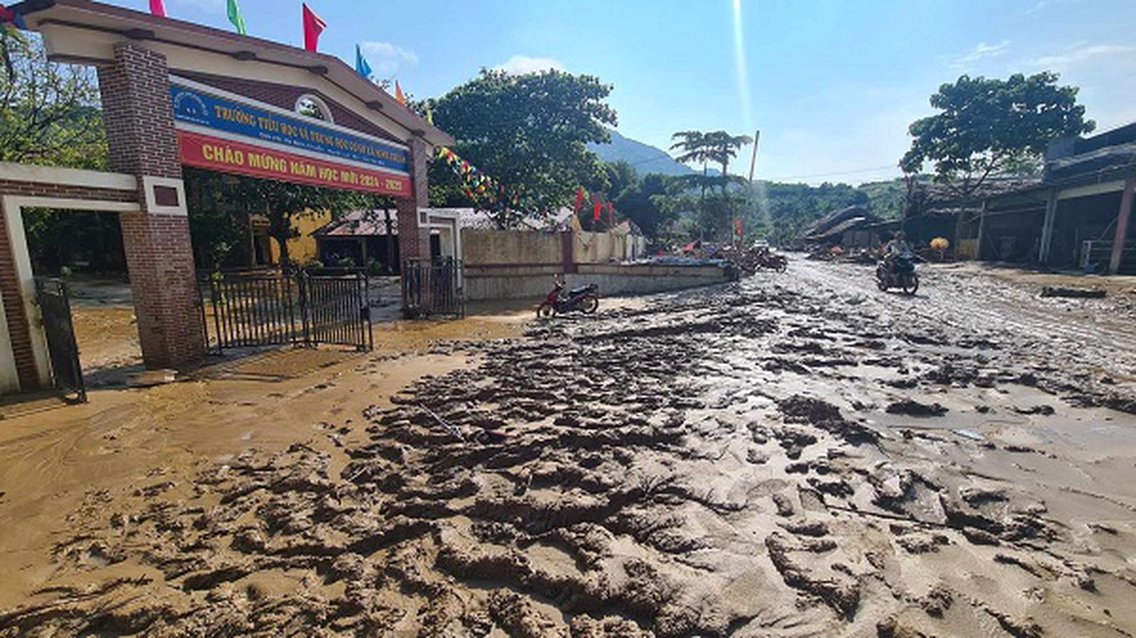 Ngổn ngang bùn đất tại cổng Trường Tiểu học và Trung học cơ sở xã Minh Chuẩn. Ảnh: Bùi Bình