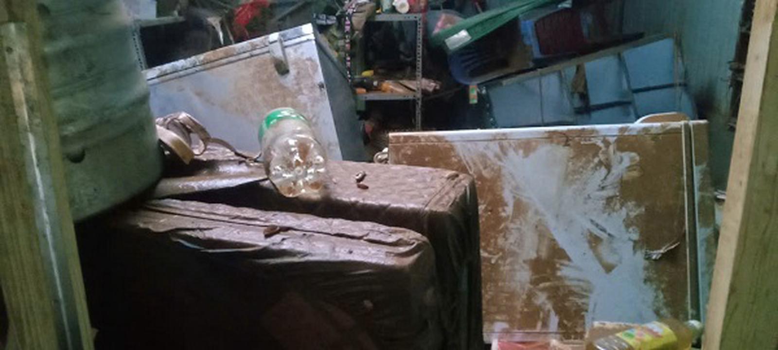 Nhà anh Vỹ bị hỏng 5 tủ lạnh dùng để bán hàng, máy điều hòa và nhiều hàng hóa, vật dụng gia đình khác. Ảnh: Bùi Bình