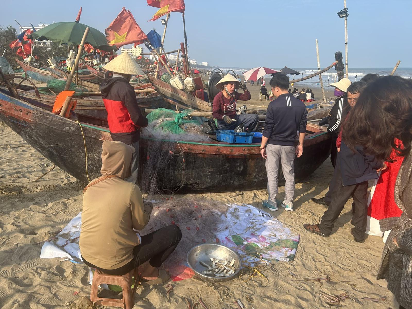 Ngày mùng 3 Tết nhiều tàu thuyền ra khơi đánh bắt vùng gần bờ đi từ rạng sáng đến trưa đã có tôm, cua và các loại cá nhỏ đưa vào. Video: Hương Trà