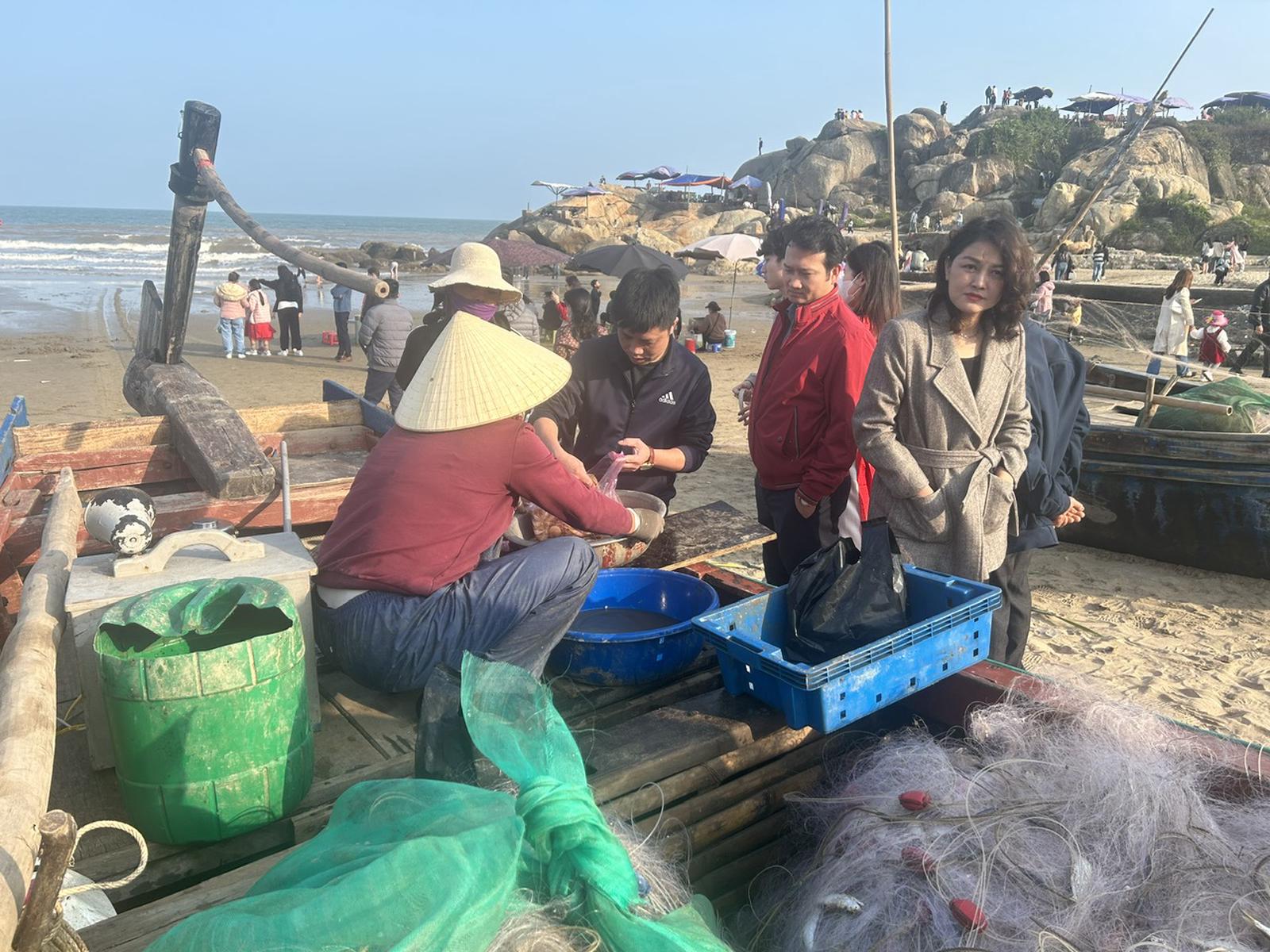 Du khách về Sầm Sơn mua hải sản của ngư dân. Ảnh: Hương Trà.