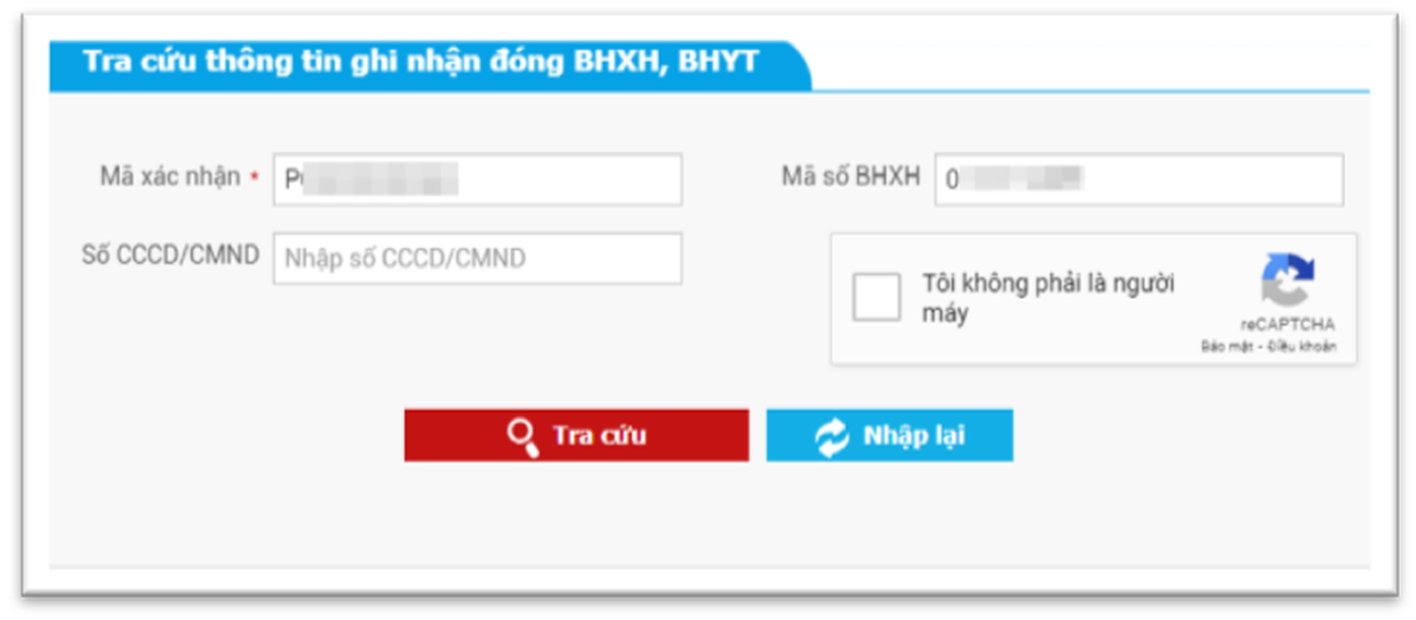 Bước 4: Nhập thông tin để tra cứu bao gồm: Mã xác nhận (do Tổ chức dịch vụ thu cung cấp) và Mã số BHXH/Số CCCD.