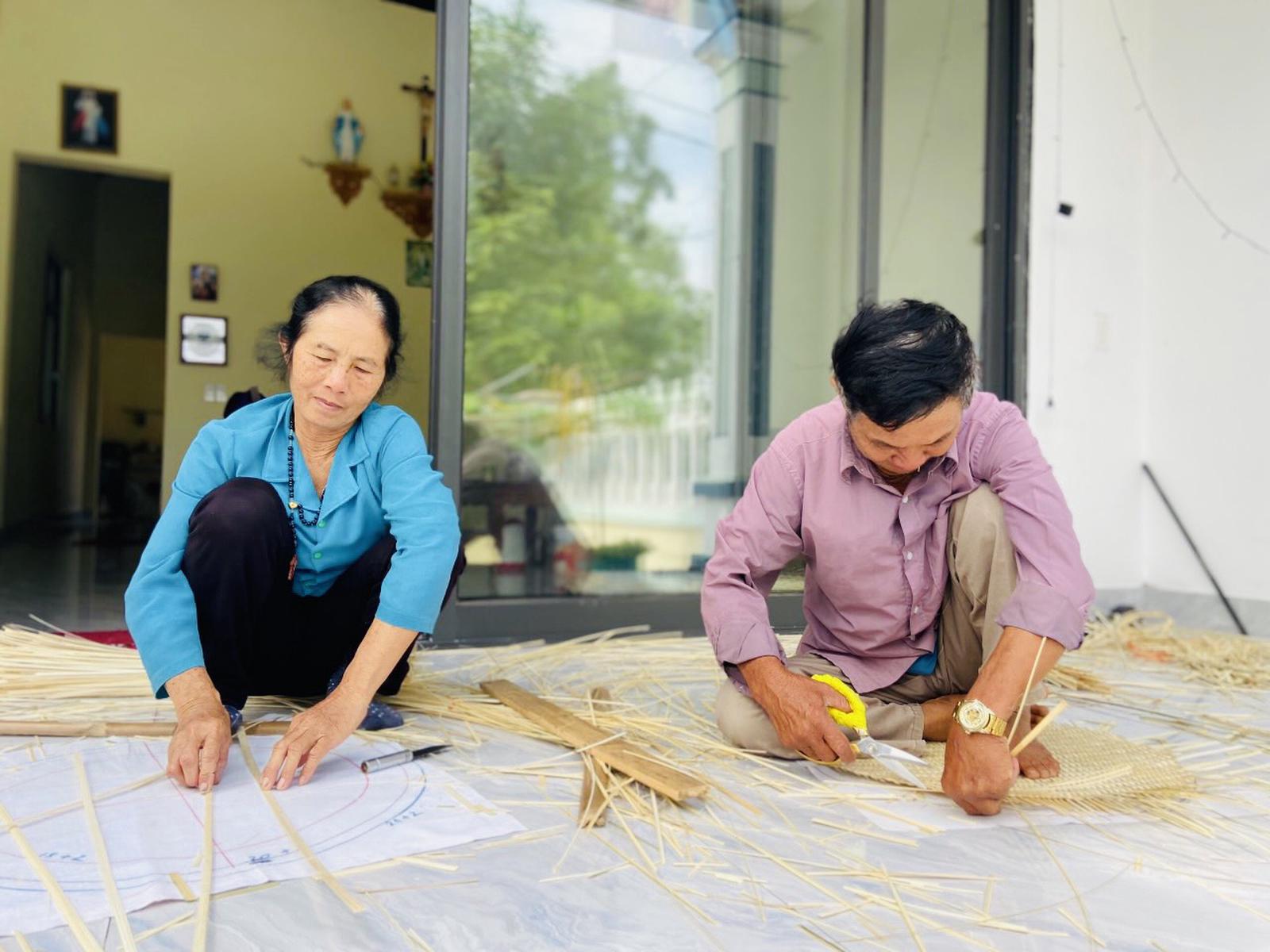 Theo chân cán bộ xã, chúng tôi đến thăm gia đình ông Nguyễn Văn Mười, 67 tuổi, ở thôn Lam Đạt, xã Thiệu Vũ, huyện Thiệu Hoá. Vợ chồng ông bà Mười đang ngồi đan những vật dụng bằng mây tre để nhập cho công ty gần nhà.