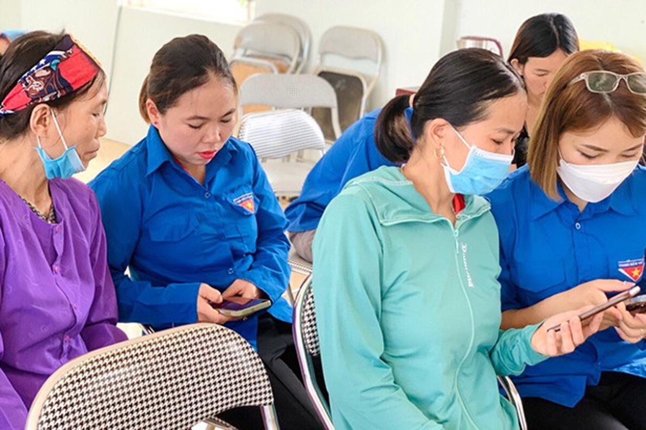 Đoàn viên thanh niên huyện Lục Yên hướng dẫn người dân cài đặt YenBai-S. Ảnh: Hồng Duyên