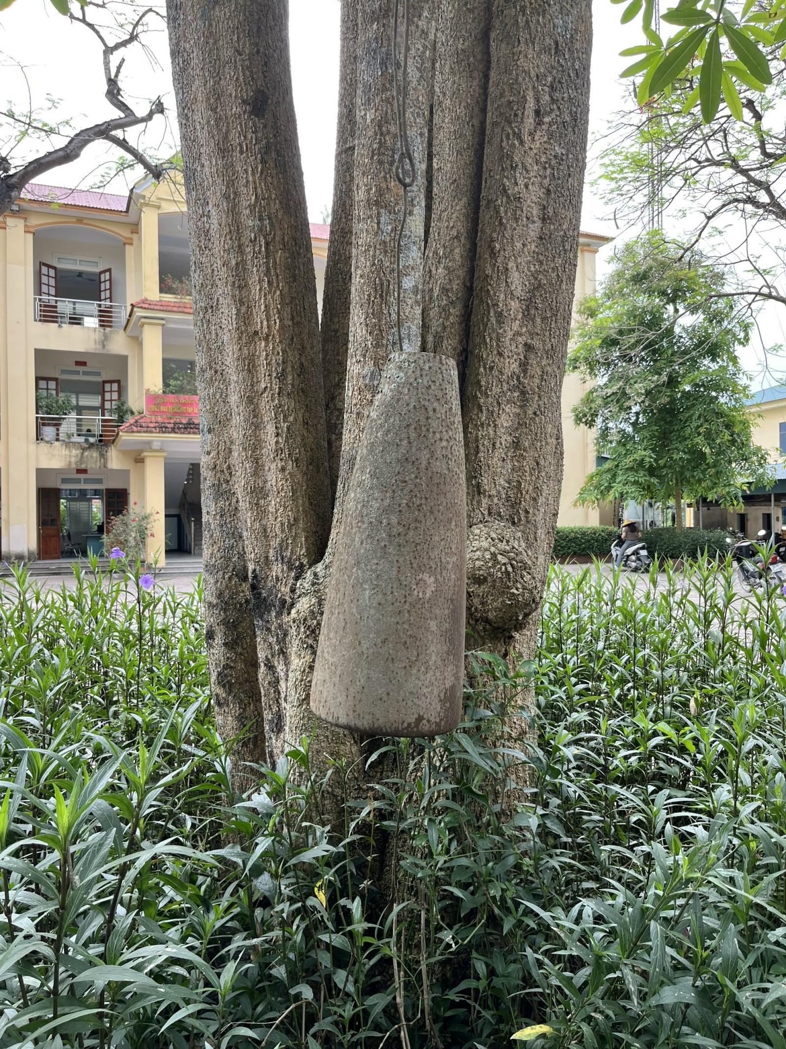 Vỏ bom trục vớt từ Bến đò Cố Xin đang được treo ở khuôn viên xã. Ảnh: XT