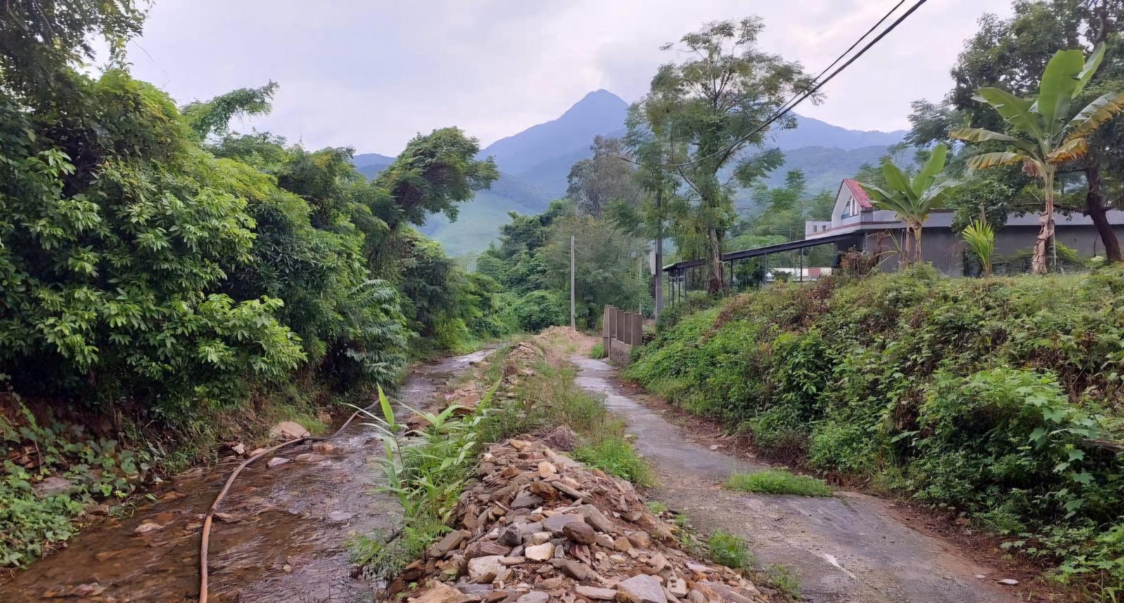 Bà Lài cho biết, mùa mưa năm 2023, nước lũ cuốn cả đất, đá lẫn cây cối từ trên đỉnh núi cao hơn 100m đổ xuống khu dân cư; toàn bộ diện tích ao cá, chuồng trại chăn nuôi của gia đình bà bị cuốn phăng, mọi người nháo nhào tháo chạy thoát thân…; rất may nhà cửa vẫn còn.