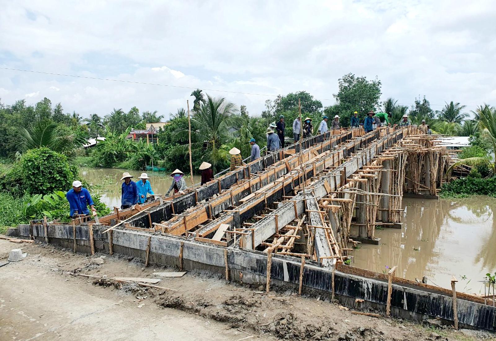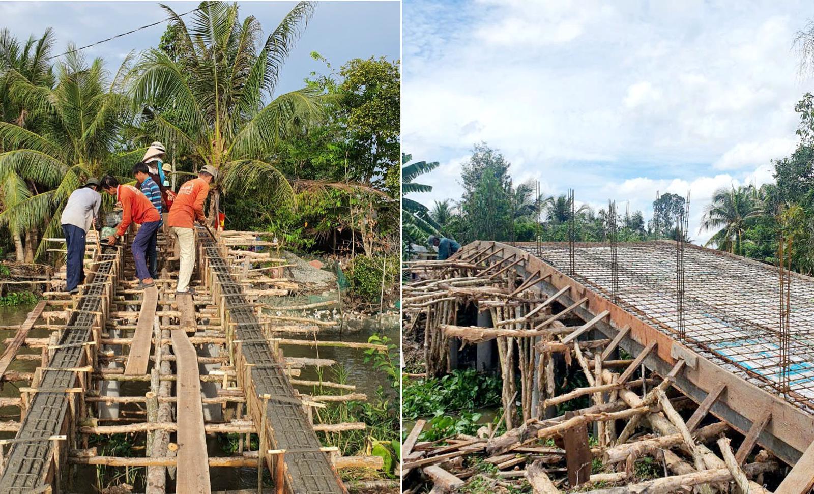 Đội xây cầu thiện nguyện chùa Vĩnh Phước làm cầu giúp người dân ở các vùng khó khăn của tỉnh Sóc Trăng đi lại và giao thương thuận tiện. Ảnh: XL