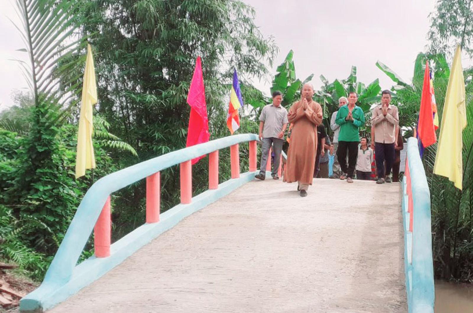 Thượng tọa Thích Định Hương và đội thiện nguyện đã vận động xây dựng hàng trăm cây cầu giao thông nông thôn bằng bê tông. Ảnh: XL