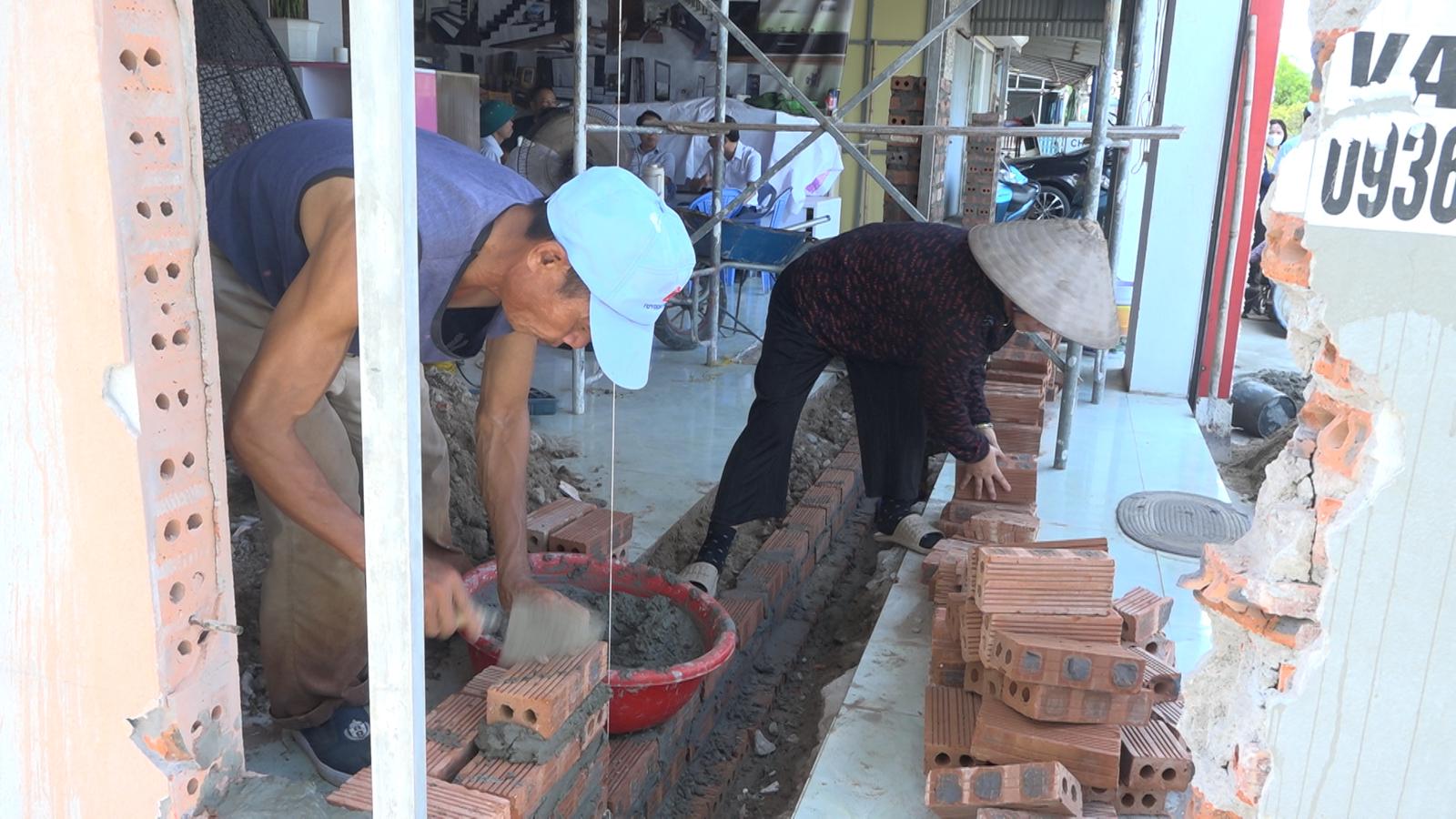 Gia đình ông Trần Trọng Mật, xã Đông Cơ chủ động thuê thợ xây dựng lại công trình sau khi hiến đất làm đường. Ảnh: Hồng Thắm