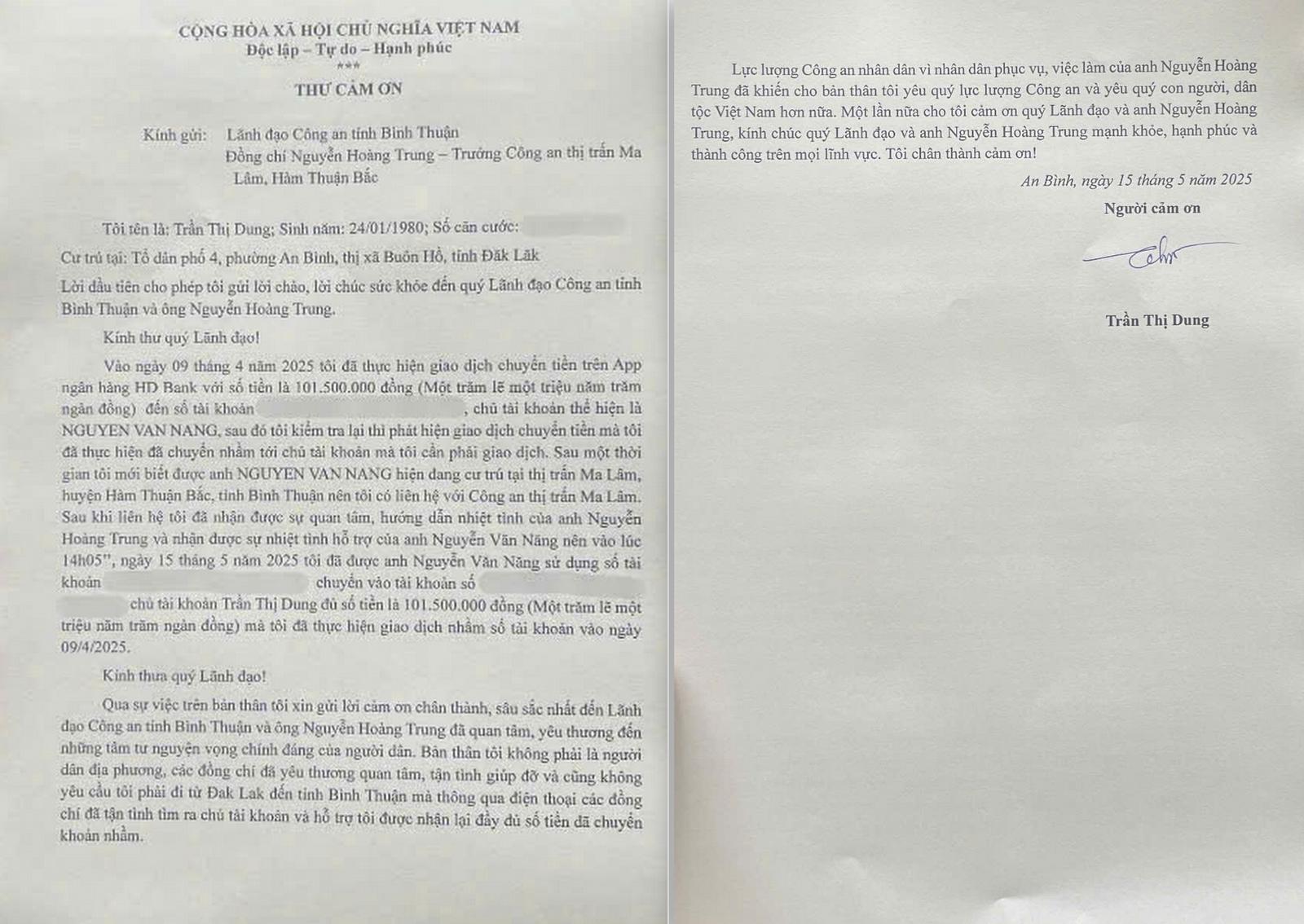 Trong thư, bà Dung bày tỏ lòng biết ơn sâu sắc đối với sự tận tâm, trách nhiệm và phối hợp hiệu quả trong thực hiện nhiệm vụ của lực lượng Công an cả hai địa phương, đặc biệt là Trung tá Nguyễn Hoàng Trung – Trưởng Công an thị trấn Ma Lâm và sự hỗ trợ ban đầu từ Công an phường An Bình. Bà Dung nhấn mạnh, nhờ sự phối hợp kịp thời và tận tình của các đơn vị Công an, bà đã nhanh chóng nhận lại được số tiền bị chuyển nhầm.