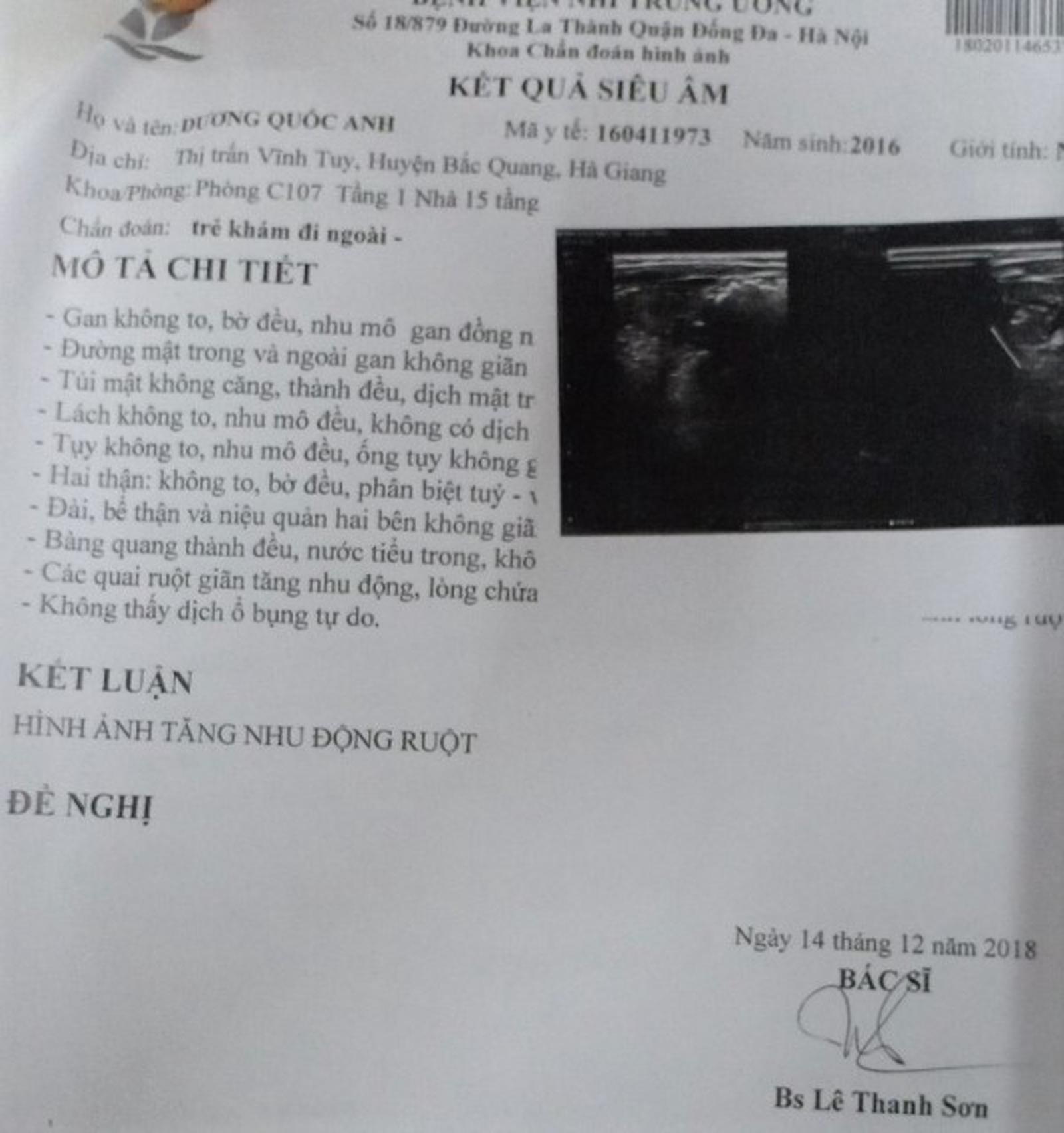 Kết quả siêu âm cháu Dương Quốc Anh bị tăng nhu động ruột