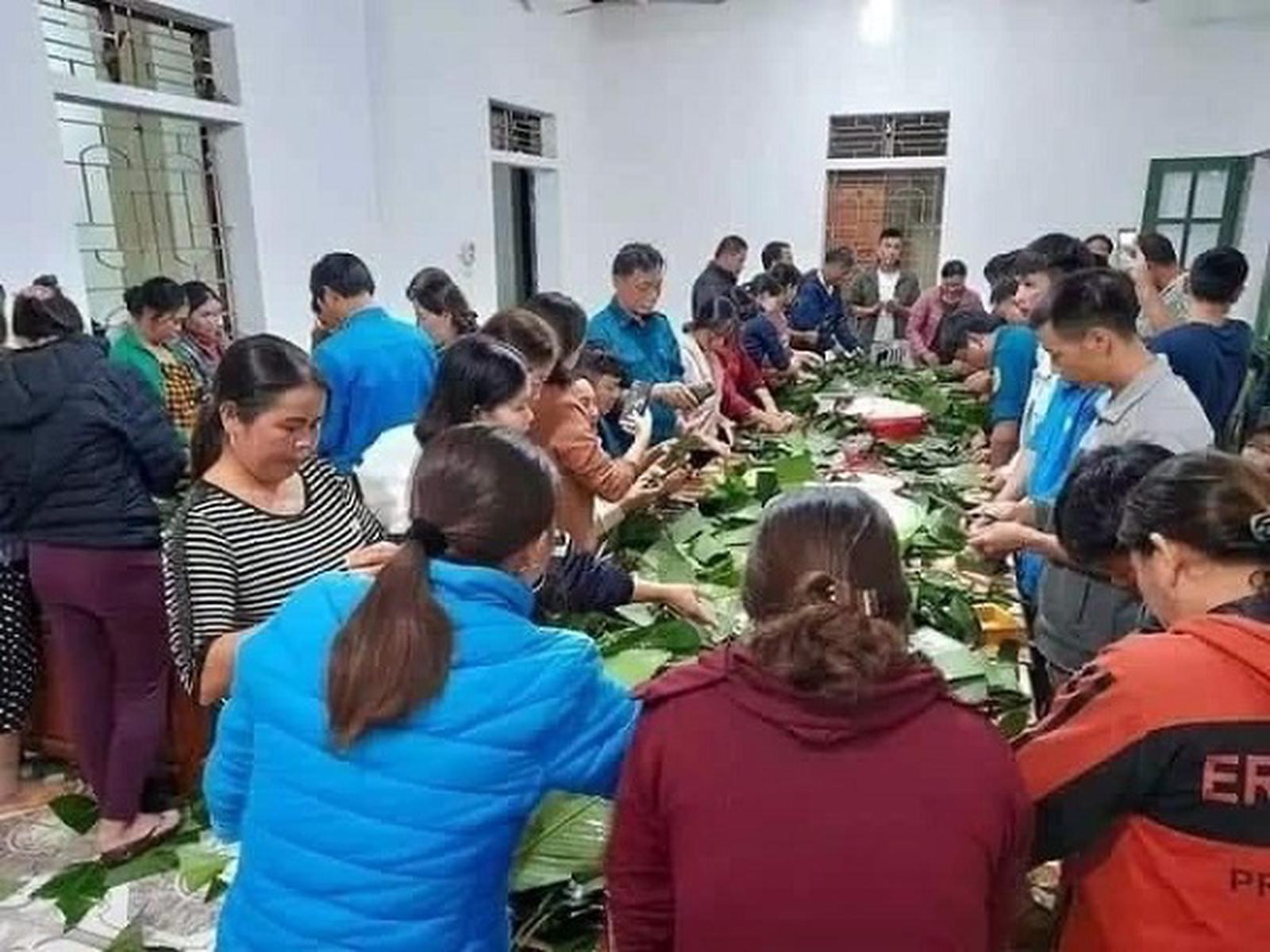 Người dân xã Nghĩa Xuân, huyện Quỳ Hợp, tỉnh Nghệ An thức thâu đêm gói bánh để gửi cho người dân đang bị lũ lụt. Ảnh: TQ
