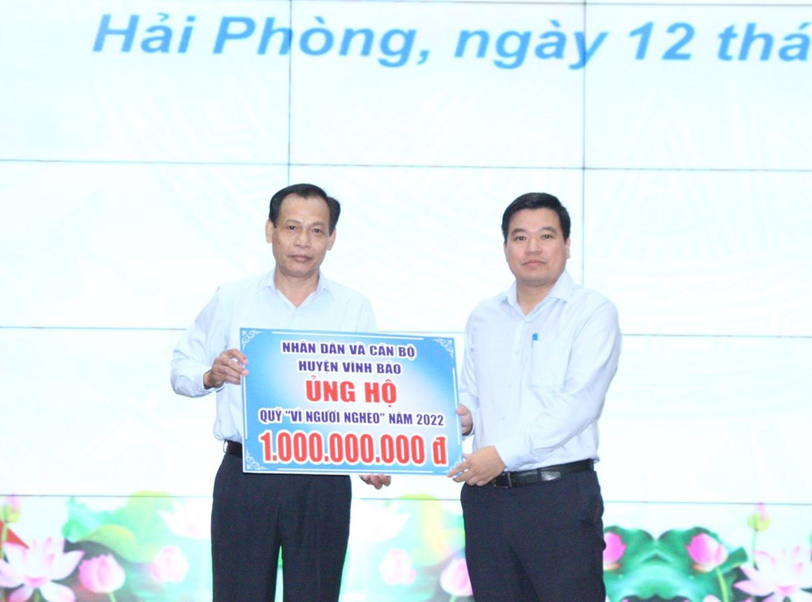 Nhân dân và cán bộ huyện Vĩnh Bảo trao kinh phí ủng hộ Quỹ " Vì người nghèo". Ảnh: KT