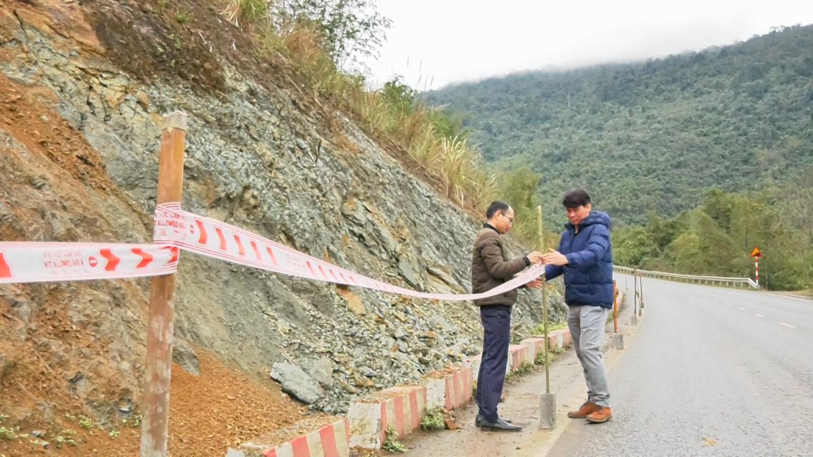 Cơ quan chức năng quản lý tuyến quốc lộ 15A giăng dây cảnh báo cấm người và phương tiện đến sát khu vực nguy cơ sạt lở. Ảnh: Hương Trà