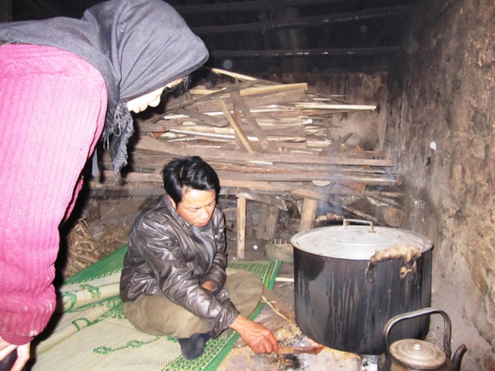 Mẹ tôi cùng em trai nấu bánh chưng đêm 30 Tết. Ảnh: Mai Thắng