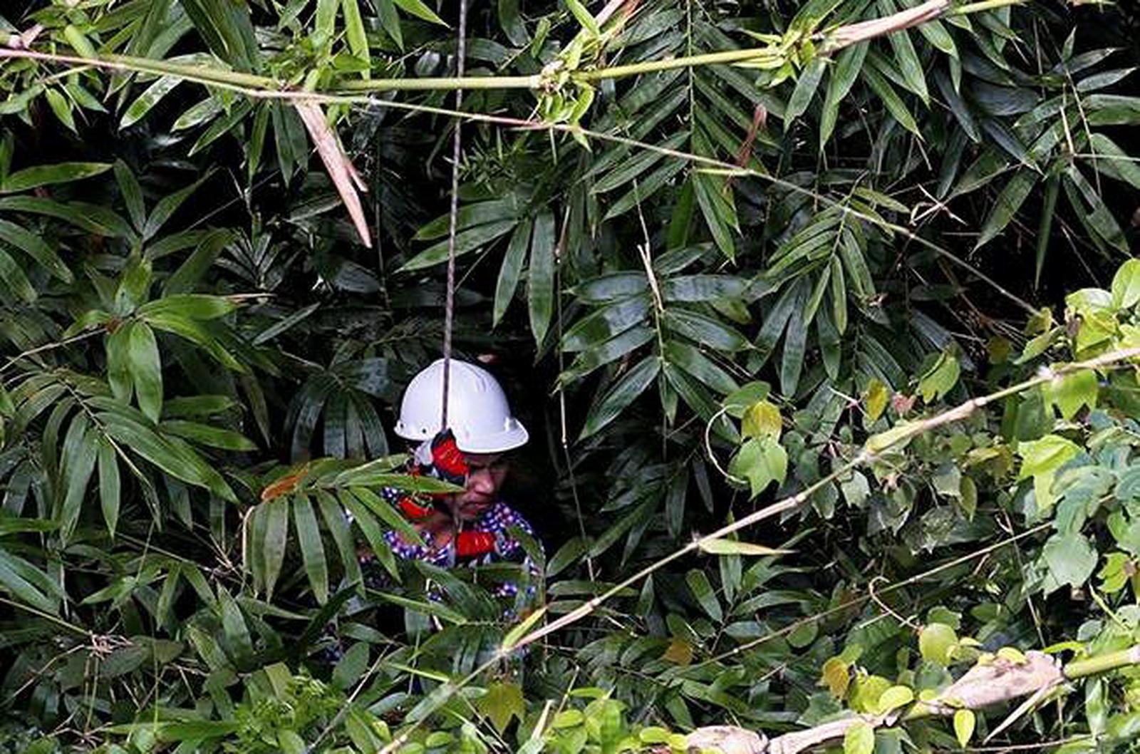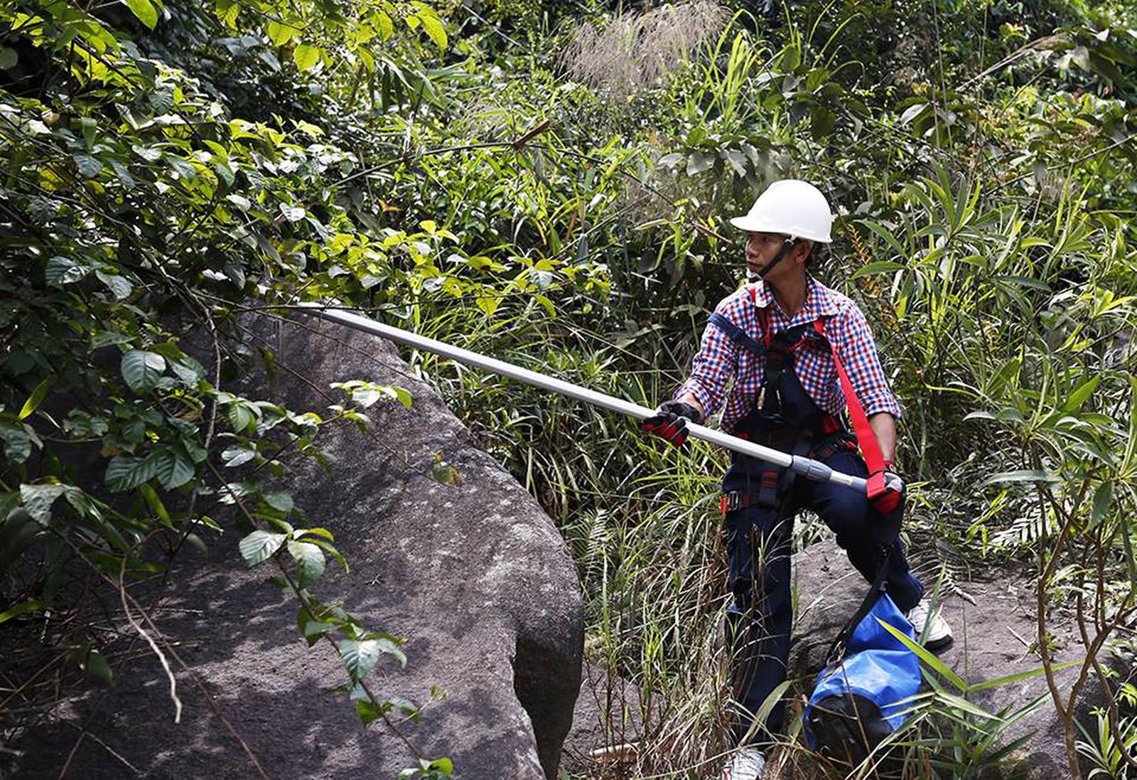 ...và các chàng "Tarzan" đu dây xuống rừng nhặt rác. Việc đu dây sẽ giúp nhặt rác ở những địa hình hiểm như trên tán cây, ngọn cây, trên vách núi, chỏm đá trên thác...