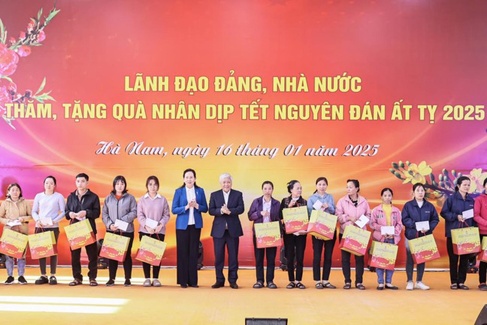 Ông Đỗ Văn Chiến, Chủ tịch UBTƯ MTTQ Việt Nam và bà Lê Thị Thủy, Bí thư Tỉnh ủy, Chủ tịch HĐND tỉnh Hà Nam tặng quà cho người nghèo, công nhân lao động có hoàn cảnh khó khăn trên địa bàn tỉnh Hà Nam. Ảnh: Q.Vinh