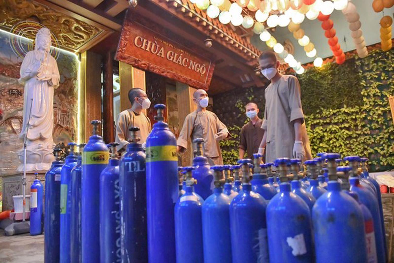 Vận chuyển bình oxy cung cấp kịp thời cho các trường hợp F0 tại chùa Giác Ngộ, TP HCM. Ảnh: mattran.org.vn