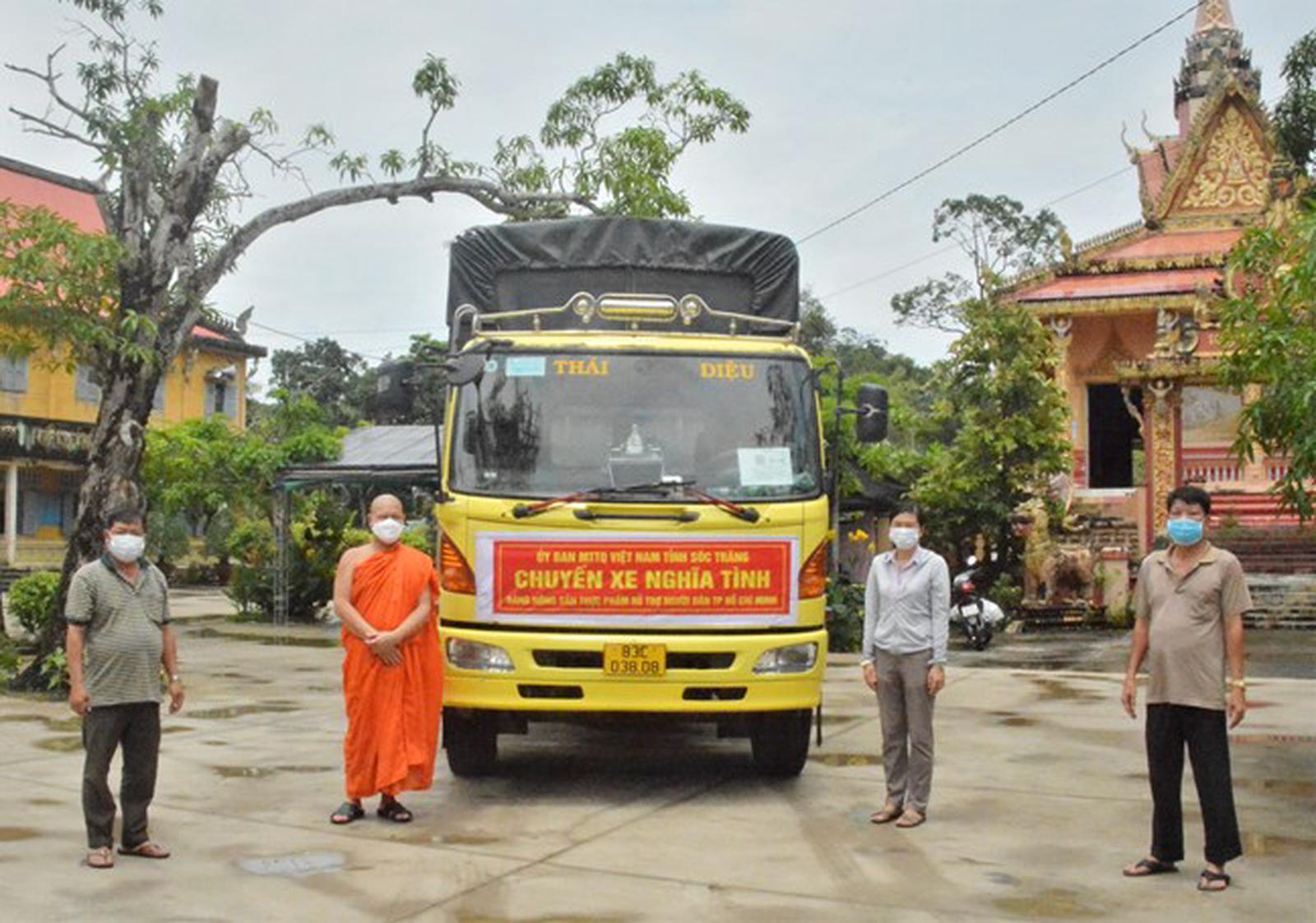 Chùa Som Rông, Sóc Trăng phối hợp cùng MTTQ địa phương thực hiện “Chuyến xe nghĩa tình” nhằm hỗ trợ cho người dân TP HCM. Ảnh: mattran.org.vn
