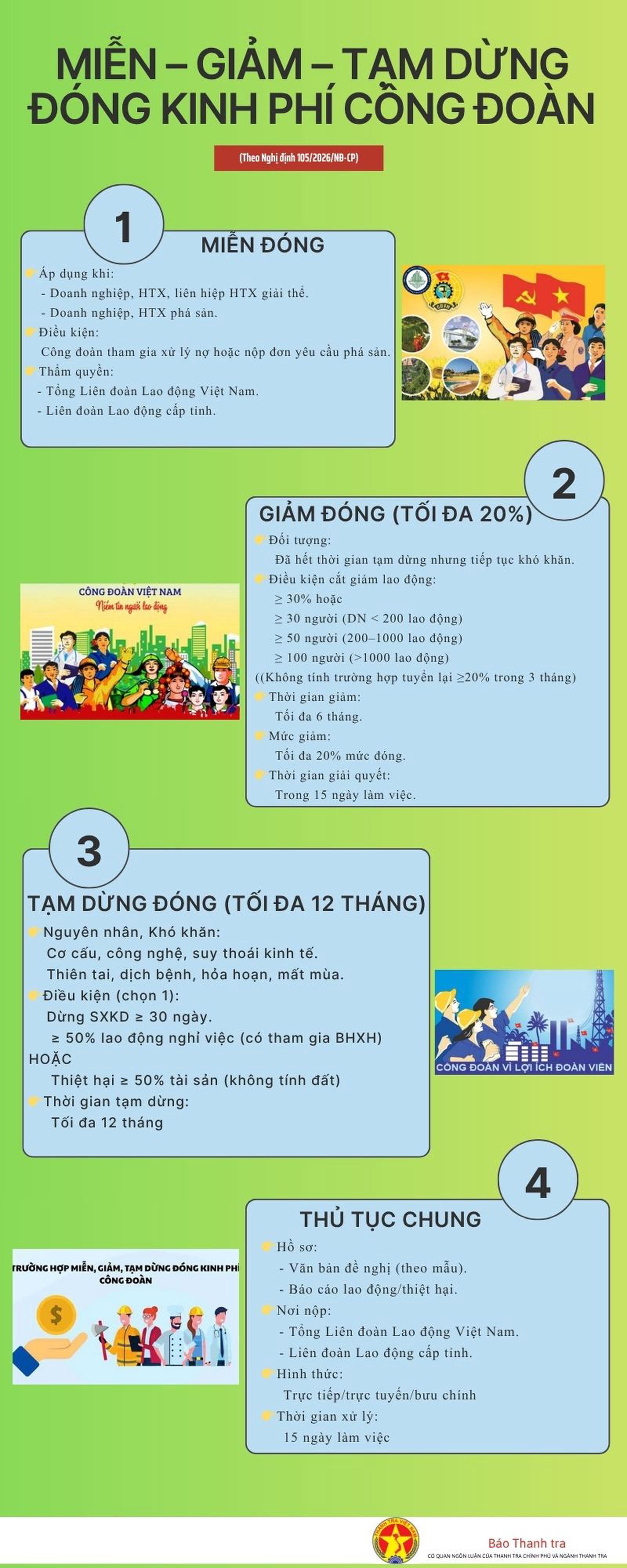 (Thanh tra) - Doanh nghiệp giải thể, phá sản hoặc gặp khó khăn do suy thoái kinh tế, thiên tai, dịch bệnh… có thể được miễn, giảm tối đa 20% hoặc tạm dừng đóng kinh phí công đoàn đến 12 tháng theo quy định tại Nghị định 105/2026/NĐ-CP.