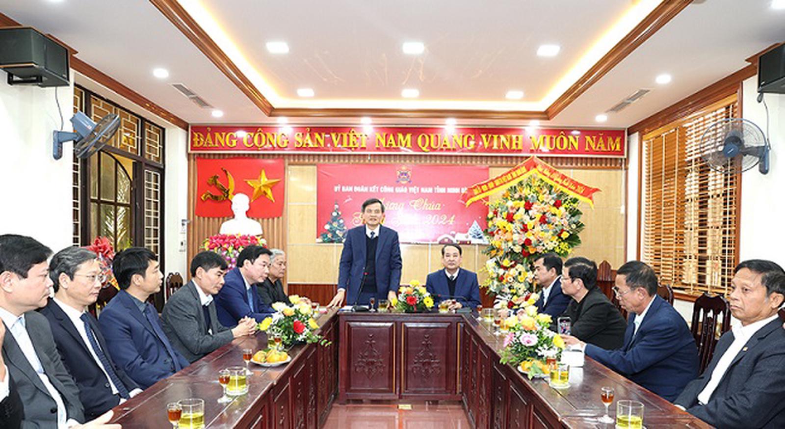 Bí thư Tỉnh ủy Đoàn Minh Huấn chúc mừng Ủy ban Đoàn kết Công giáo tỉnh Ninh Bình. Ảnh: BNB.