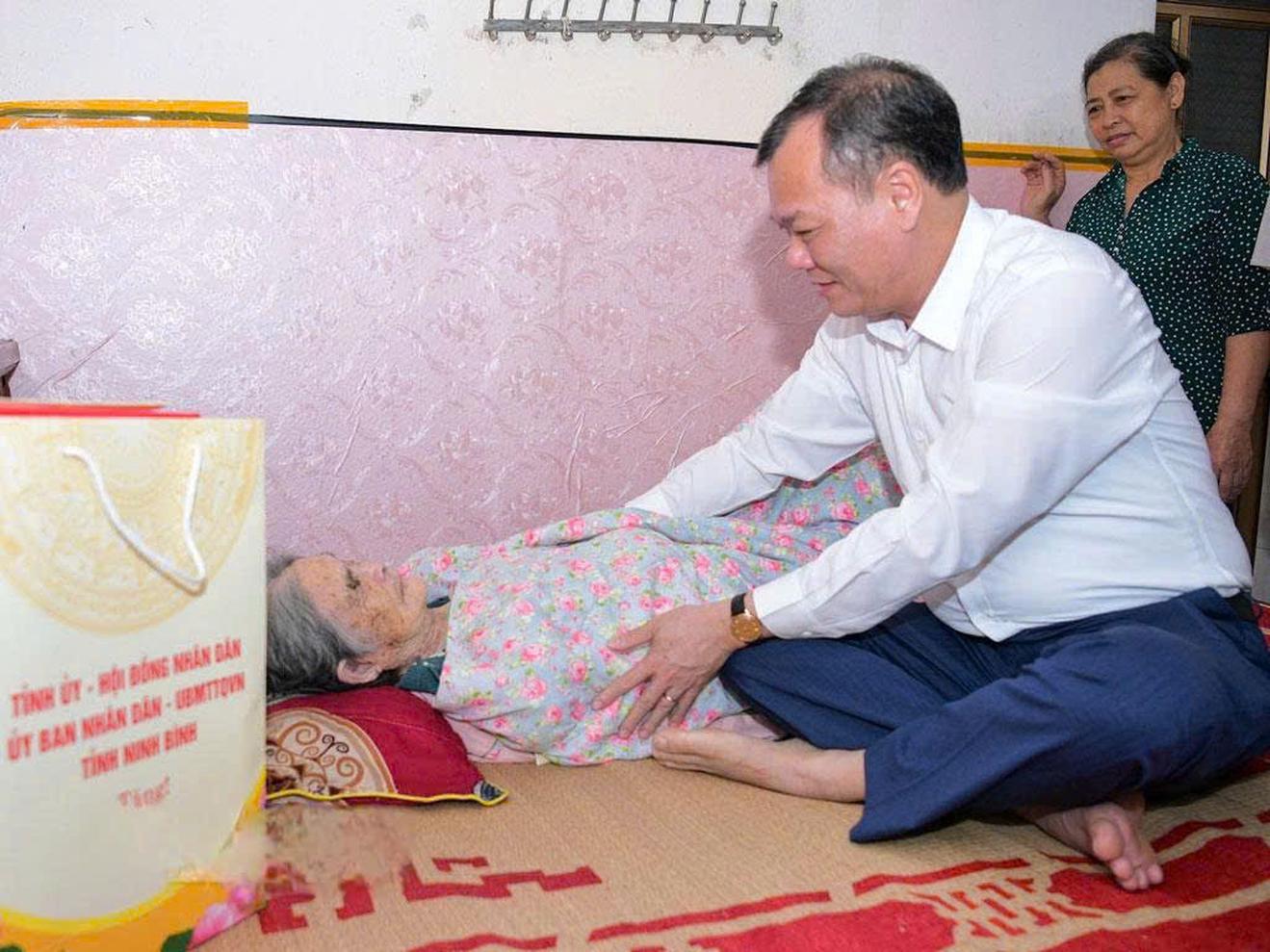 Tại các gia đình đến thăm, Phó Bí thư Tỉnh ủy, Chủ tịch HĐND tỉnh Ninh Bình Lê Quốc Chỉnh ân cần thăm hỏi tình hình sức khỏe, đời sống của Mẹ Việt Nam Anh hùng, cán bộ tiền khởi nghĩa và người có công.