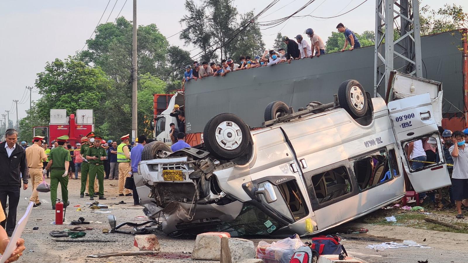 (Thanh tra) - Ô tô khách 16 chỗ va chạm với xe container trên tuyến đường ven biển thuộc xã Tam Hiệp, huyện Núi Thành khiến 8 người chết và 12 người bị thương.