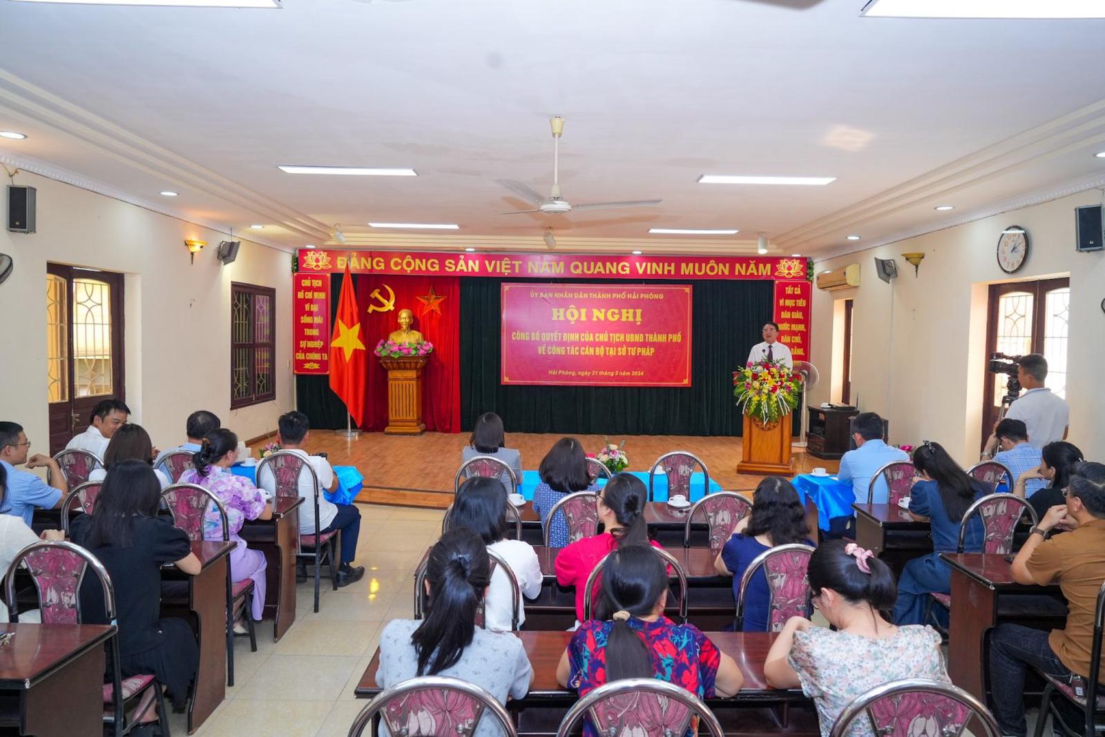 Tại hội nghị, Phó Giám đốc Sở Nội vụ Đào Duy Phương công bố Quyết định số 1589/QĐ-UBND ngày 21/5/2024 của Chủ tịch UBND thành phố, bổ nhiệm ông Trần Đức Huấn, Trưởng phòng Phòng Quản lý xử lý vi phạm hành chính và Theo dõi thi hành pháp luật, Sở Tư pháp giữ chức vụ Phó Giám đốc Sở Tư pháp, thời hạn bổ nhiệm là 05 năm.