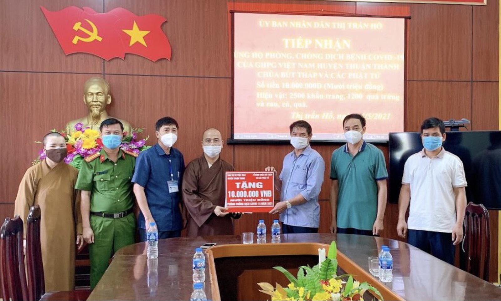 Ban Trị sự Phật giáo huyện Thuận Thành cùng chư tăng chùa Bút Tháp ủng hộ tịnh tài, tịnh vật cho tuyến đầu phòng chống dịch Covid-19 tại địa phương, ngày 14/5/2021. Ảnh: Chư tăng chùa Bút Tháp