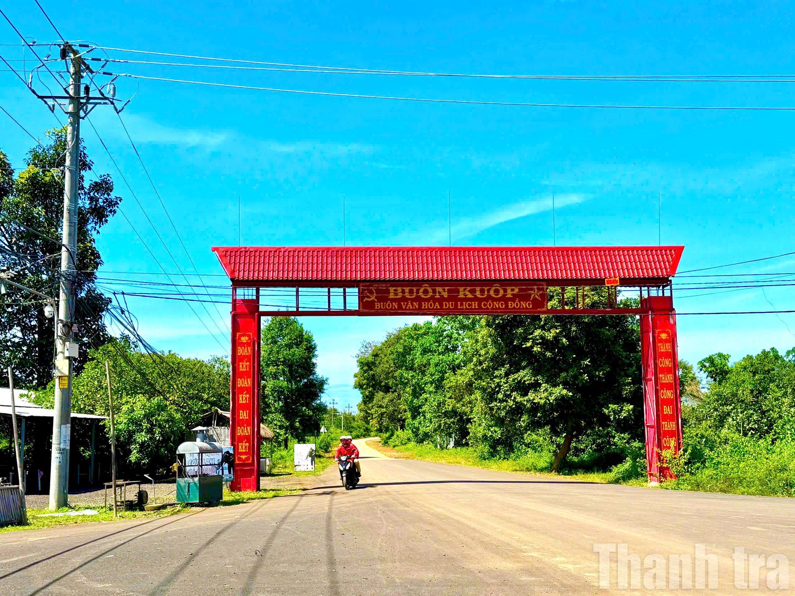 Cổng chào vào buôn Kuôp (xã Ea Na, Đắk Lắk) – buôn văn hóa du lịch cộng đồng đầu tiên của xã Ea Na, nơi người dân chung tay gìn giữ bản sắc văn hóa Ê Đê gắn với phát triển kinh tế. Ảnh: NG