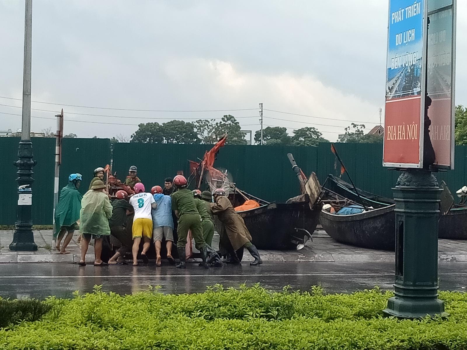 Lực lượng Công an TP Sầm Sơn tham gia giúp dân đưa thuyền vào bờ. Ảnh: VT