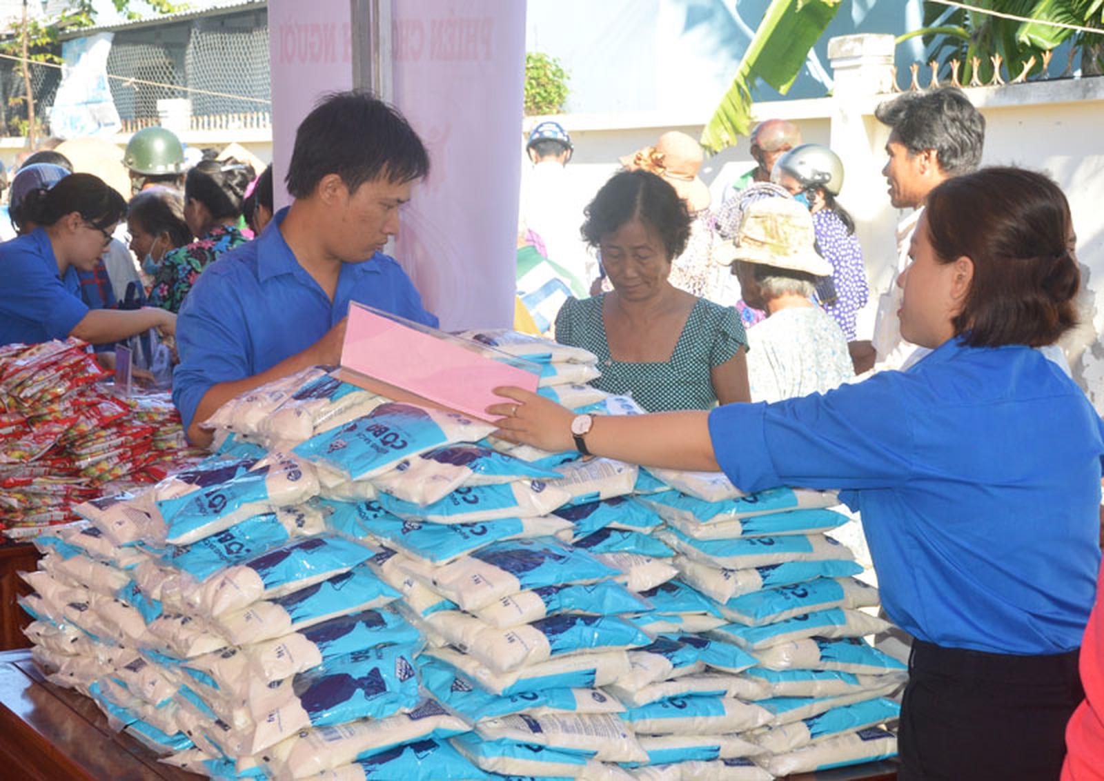 Ban Tổ chức đã bố trí quầy hàng phục vụ các mặt hàng thiết yếu như gạo, dầu ăn, nước tương, đường, hạt nêm, bột giặt, mì gói để phục vụ bà con.