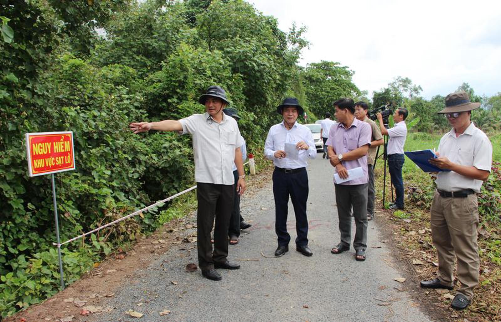Đoàn công tác kiểm tra trực tiếp tại các điểm sạt lở. Ảnh: Thảo Ly
