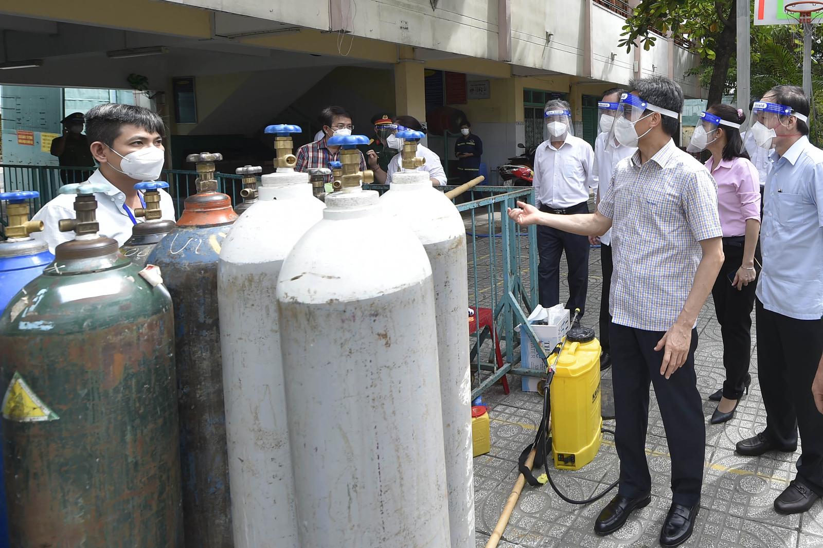 Tại khu cách ly F0 nằm trên đường Văn Thân, phường 8, Bí thư Quận uỷ quận 6 Lê Thị Hờ Rin báo cáo Phó Thủ tướng, cách đây gần 2 tháng, quận đã trang bị lượng lớn bình oxy cho các khu cách ly F0 để xử trí kịp thời những trường hợp có dấu hiệu chuyển nặng, trong khi chờ nhập viện cấp cứu.