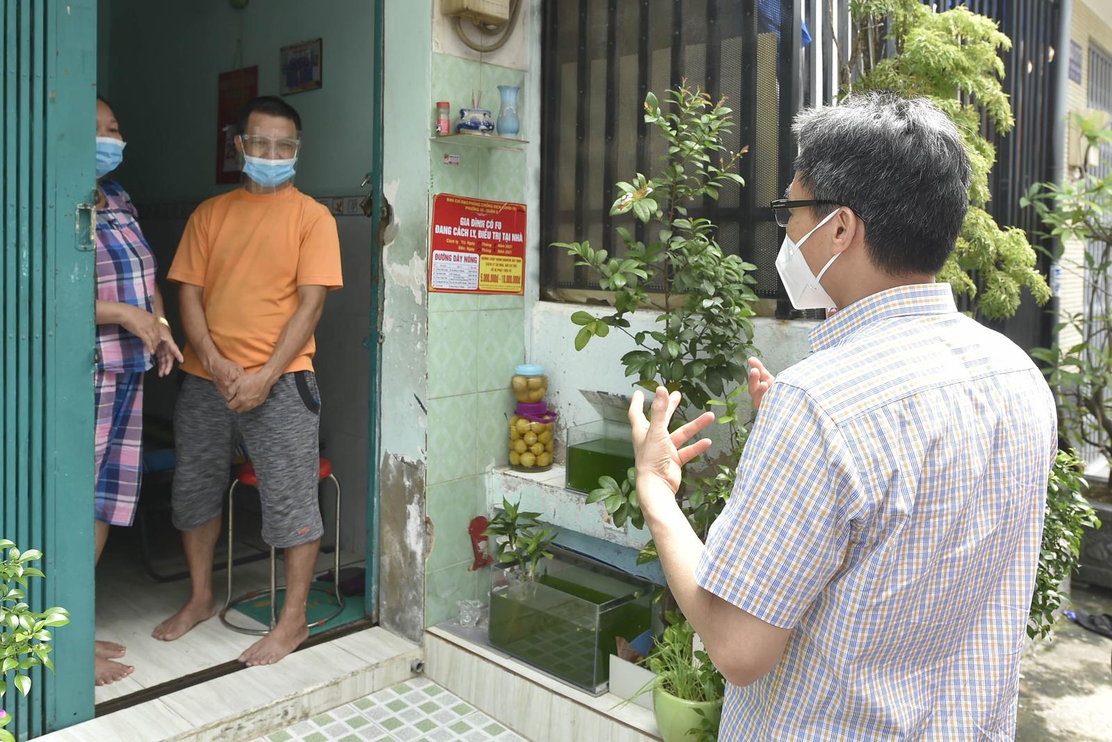 Phó Thủ tướng thăm hỏi một gia đình đang có F0 cách ly, điều trị tại nhà (ở ngõ 63, đường Lý Chiêu Hoàng, phường 10, quận 6). Ảnh: Bộ Y tế