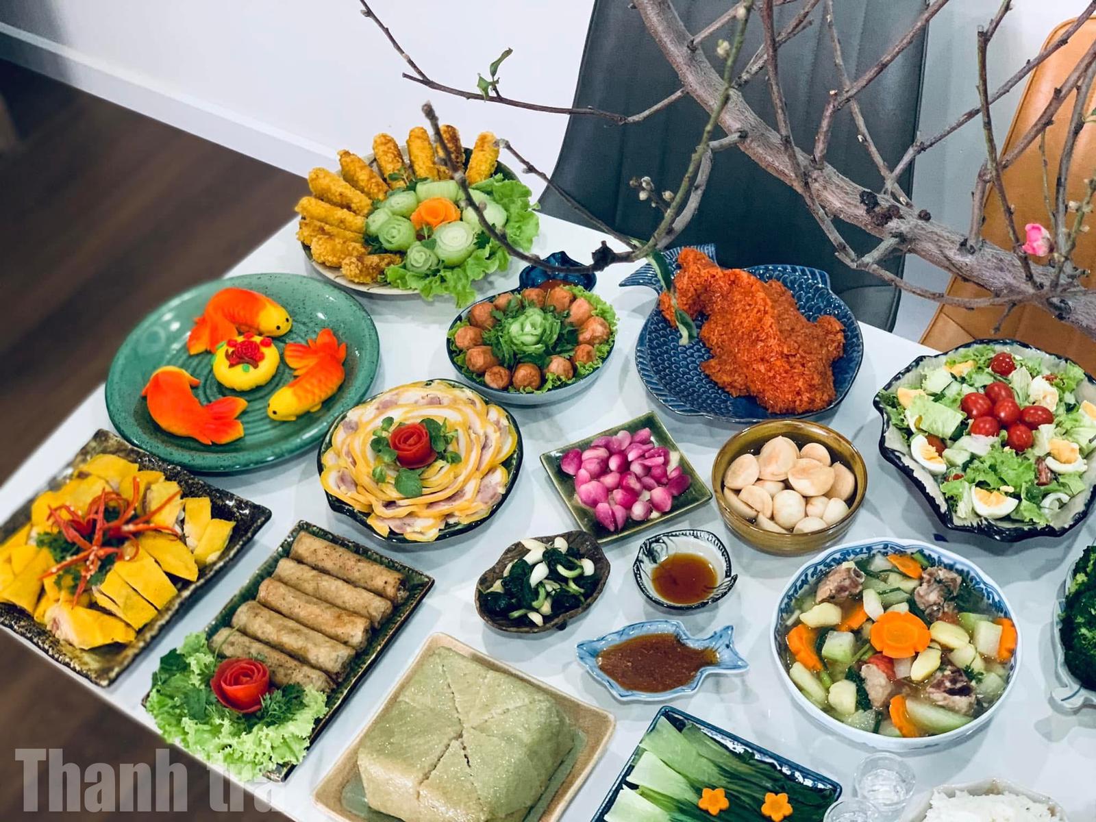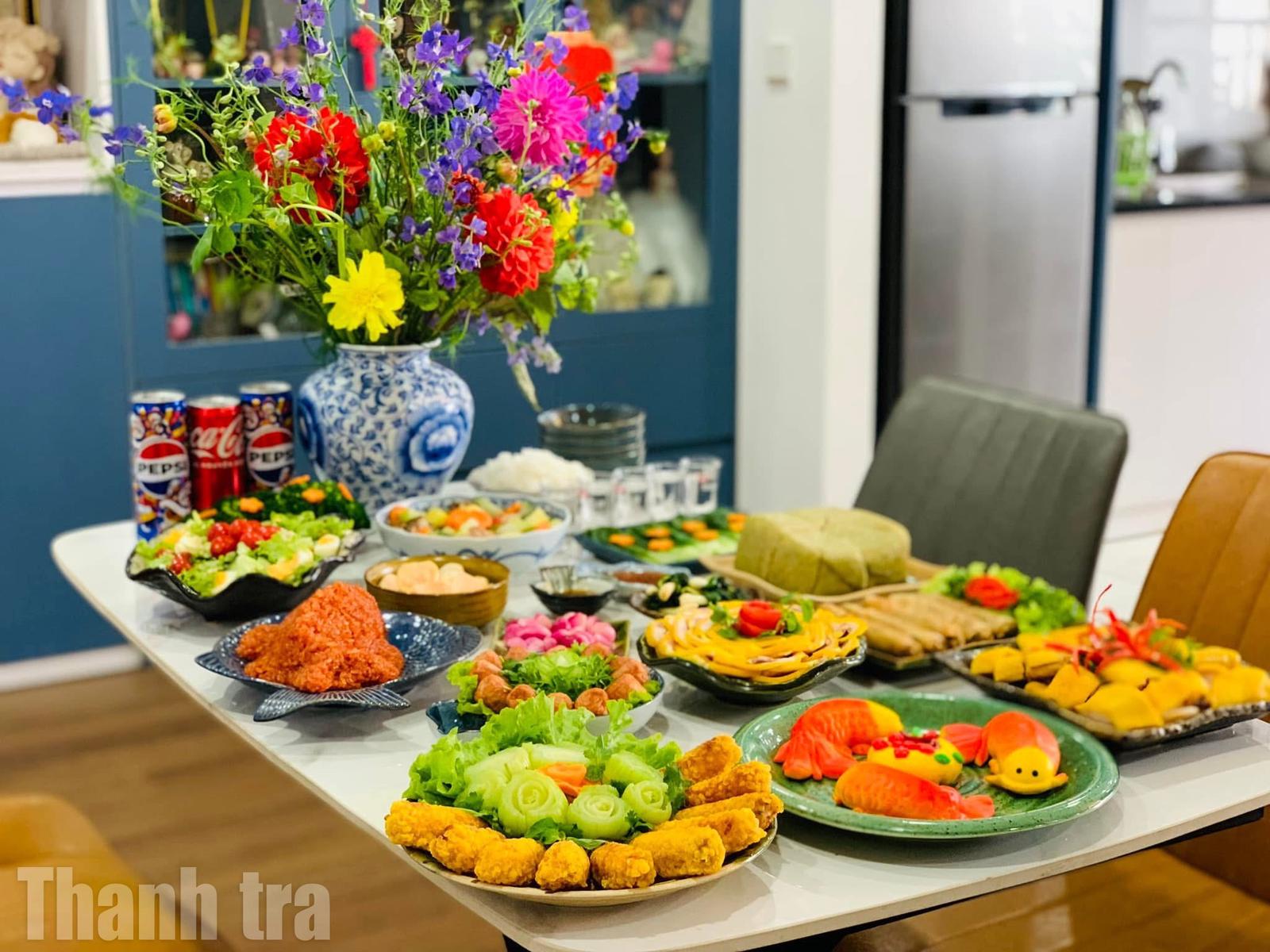 Mâm cơm tươm tất được chuẩn bị cho lễ cúng ông Công, ông Táo. Ảnh: TM