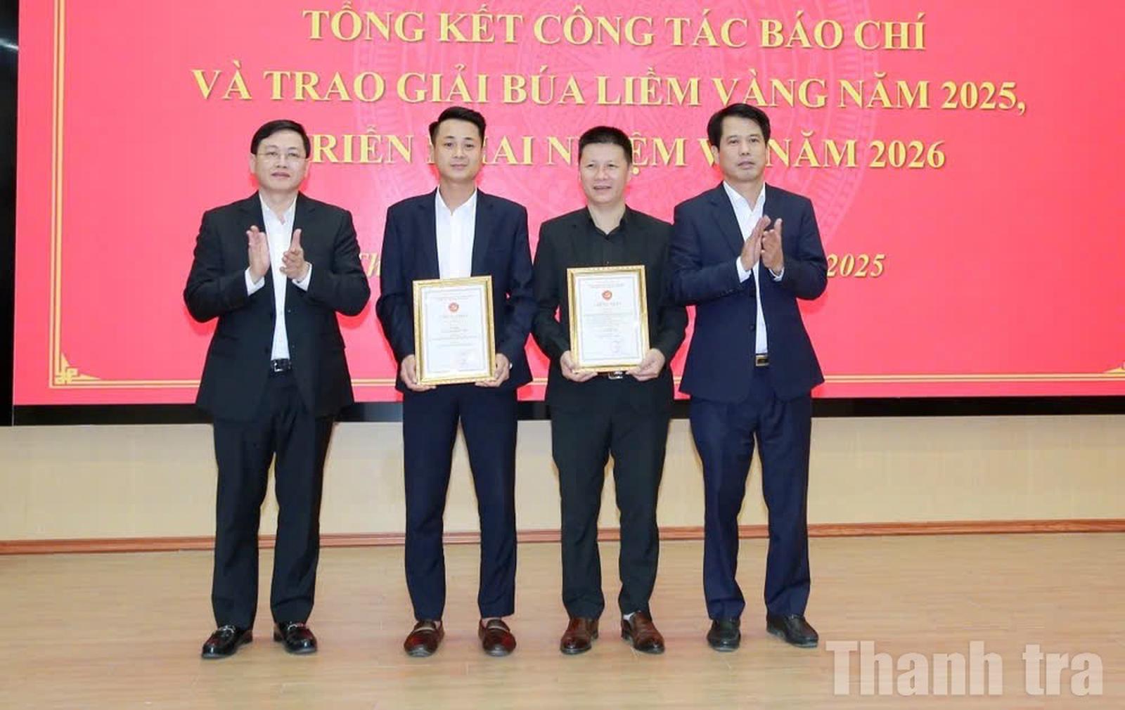 (Thanh tra) - Chiều 26/12, tỉnh Thanh Hóa tổng kết công tác báo chí, trao Giải Búa liềm vàng năm 2025 và tôn vinh các tập thể, cá nhân xuất sắc, ghi nhận cho một năm báo chí đồng hành chặt chẽ cùng sự phát triển của tỉnh. Nhà báo Nguyễn Văn Thanh, phóng viên Thường trú Báo Thanh tra tại Thanh Hóa vinh dự được nhận Bằng khen của Chủ tịch UBND tỉnh.
