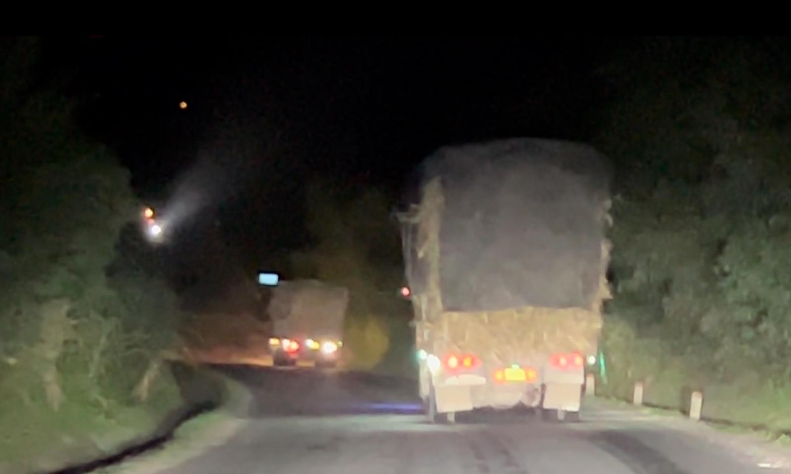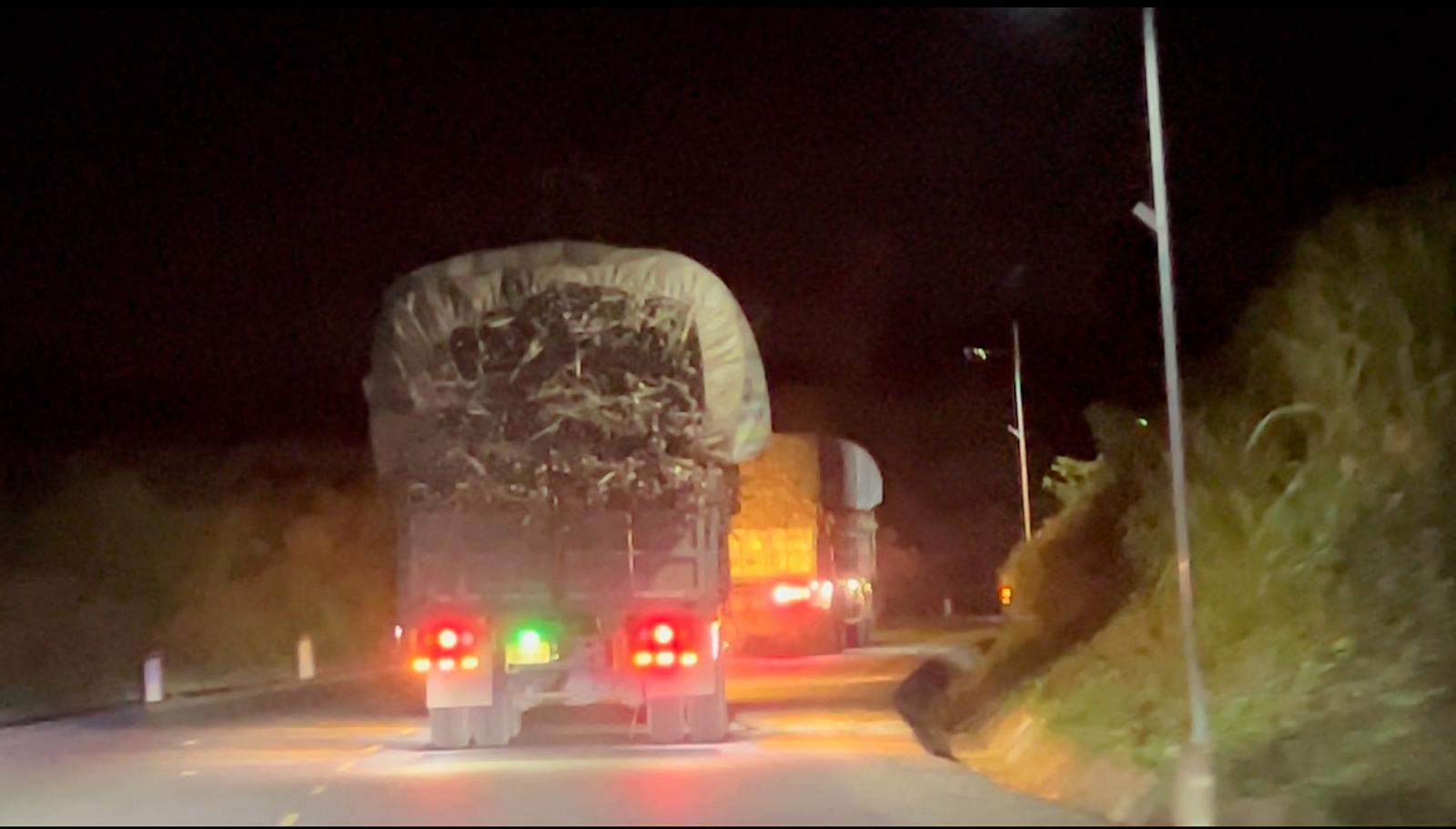 Những ngày đầu tháng 1/2024, chúng tôi có mặt tại QL25 đoạn qua huyện Sơn Hoà, tỉnh Phú Yên để ghi nhận thực tế. Thời điểm hiện tại, phần lớn các nhà máy đường trên địa bàn tỉnh Phú Yên sẽ mua nguyên liệu mía từ Gia Lai. Không kể ngày hay đêm, đoàn xe chở nguyên liệu mía quá khổ, quá tải hoạt động liên tục, ngang nhiên di chuyển trên tuyến đường. Để có thể chở được nhiều, các xe này có dấu hiệu hàn thêm khung, nâng cao thành thùng.
