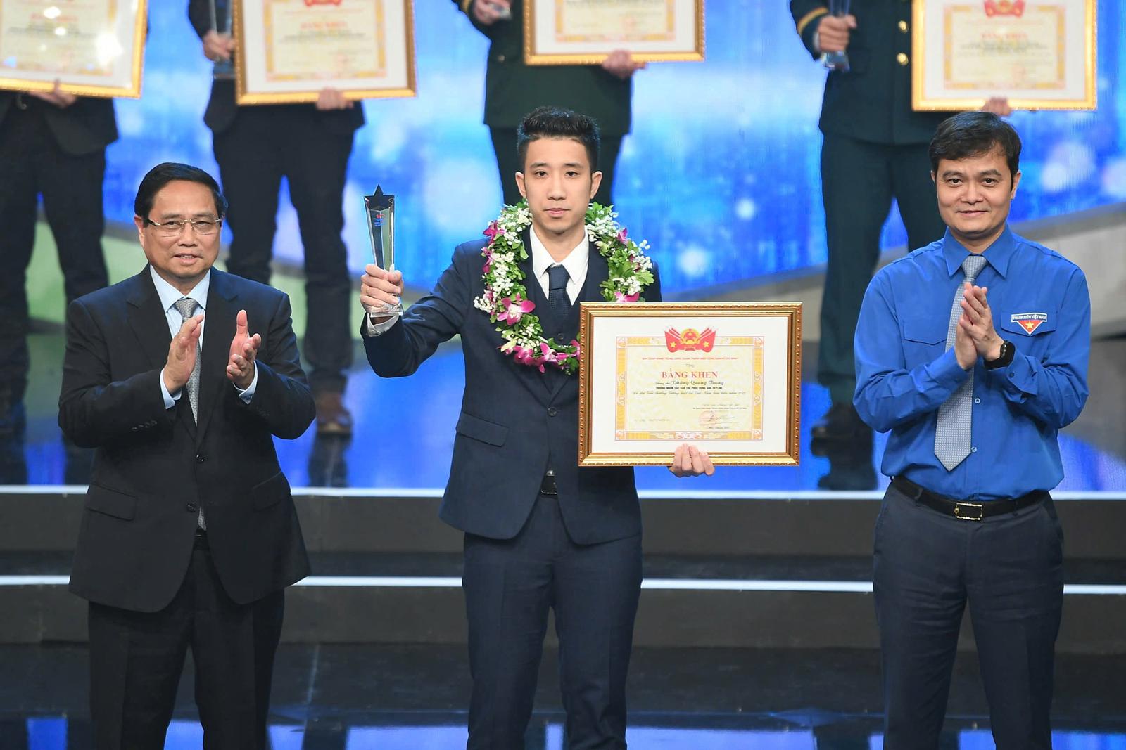 Thủ tướng Phạm Minh Chính (bìa trái) và Bí thư thứ nhất Trung ương Đoàn Bùi Quang Huy (bìa phải) trao Giải thưởng Gương mặt trẻ Việt Nam tiêu biểu cho anh Phùng Quang Trung. Ảnh: NVCC