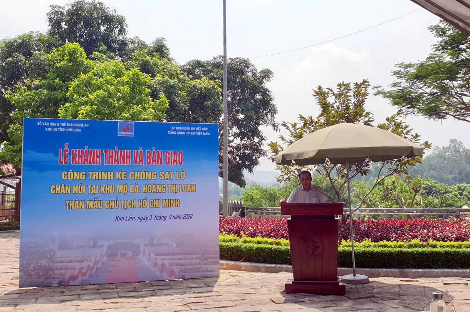 Tại buổi lễ Khánh thành bàn giao công trình, đồng chí Nguyễn Thanh Nghị đã thay mặt lãnh đạo PV GAS phát biểu, khẳng định công trình mới thêm một lần nữa chứng minh cho tinh thần đồng tâm hiệp lực, hỗ trợ hiệu quả giữa ngành Dầu khí, trong đó có Tổng Công ty Khí Việt Nam, với tỉnh Nghệ An, cũng như các địa phương khác trong cả nước. PV GAS mong muốn đồng hành cùng các chương trình phát triển văn hóa, bảo vệ di tích danh thắng, qua đó cũng hỗ trợ phát triển giáo dục lịch sử cho thế hệ trẻ, phát triển kinh tế xã hội của tỉnh Nghệ An.