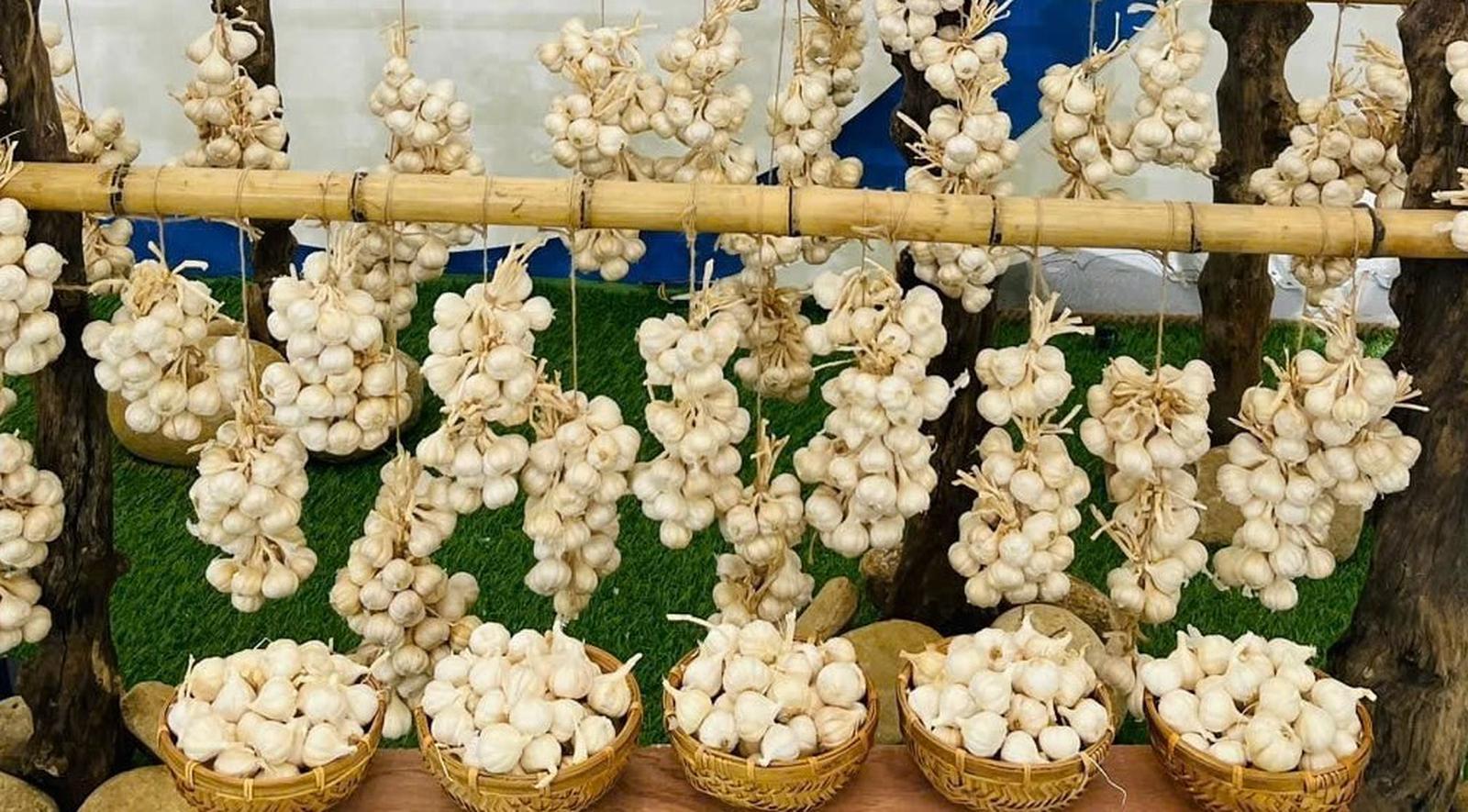 Sản vật tỏi Lý Sơn được trưng bày trong gian hàng của Quảng Ngãi. Ảnh: TL