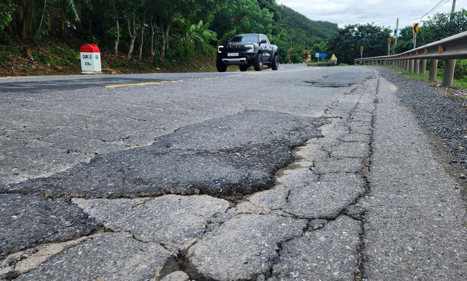 Một điểm bong tróc gây mất an toàn giao thông trên tuyến QL 9. Ảnh: Minh Tân