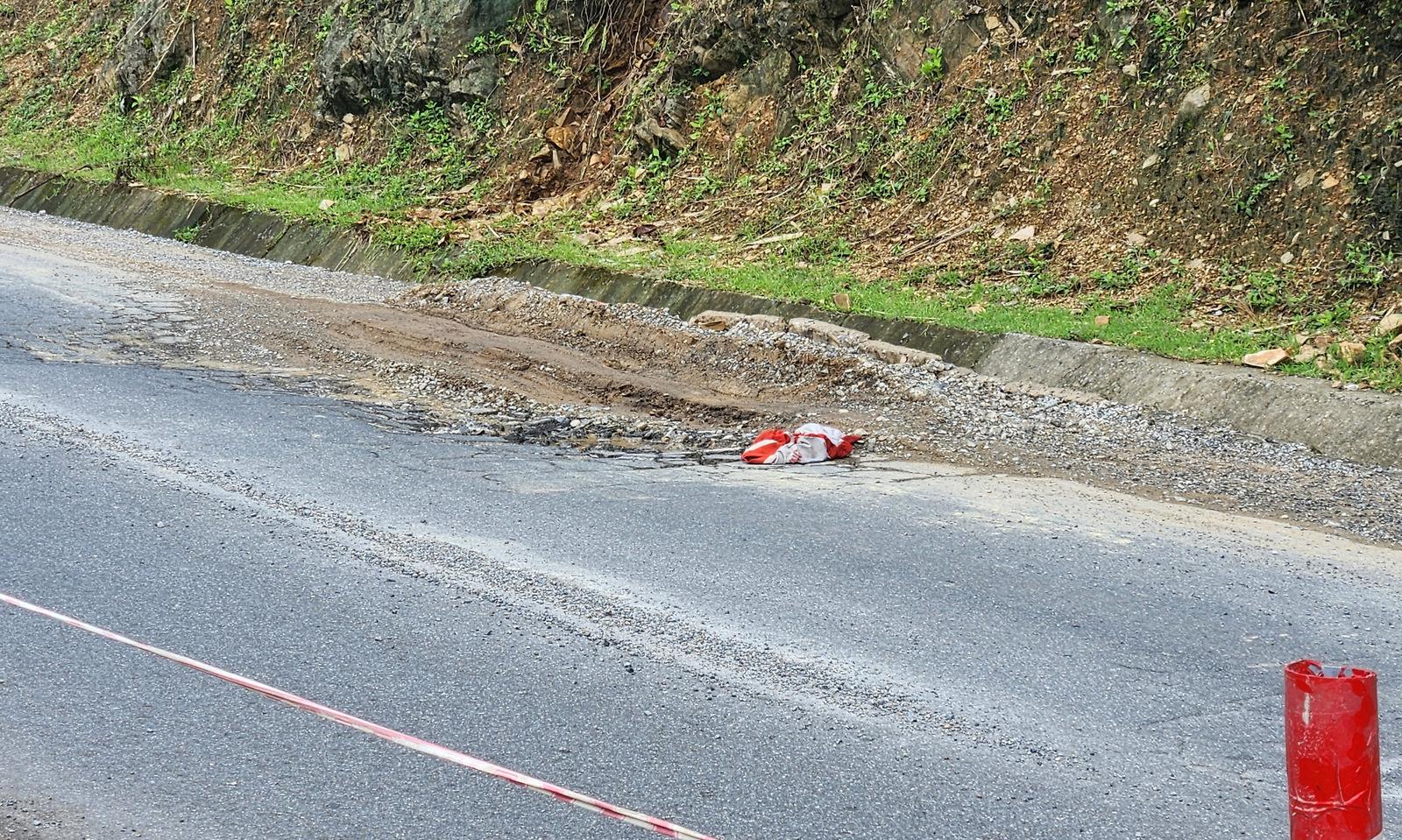 Điểm sạt lở taluy âm sâu vào mặt đường QL 9. Ảnh: Minh Tân